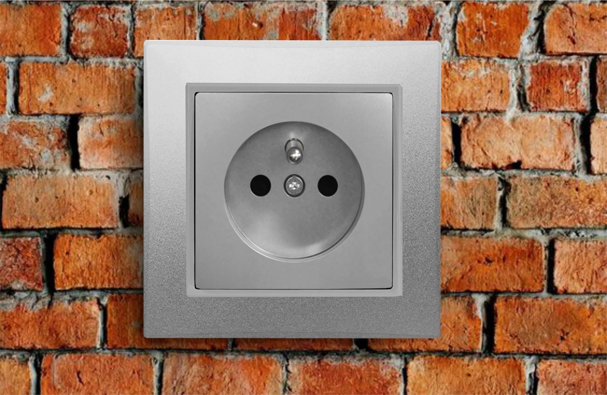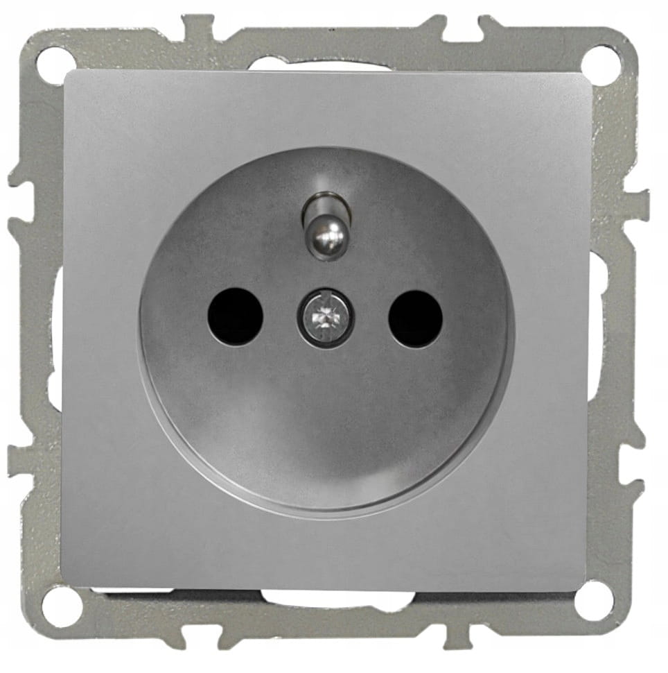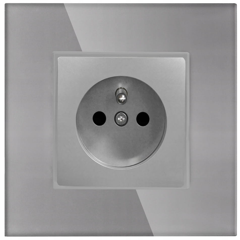 Gniazdko pojedyncze, z uziemieniem, w kolorze szarym, podtynkowe, do montażu w ramce pojedynczej lub wielokrotnej.