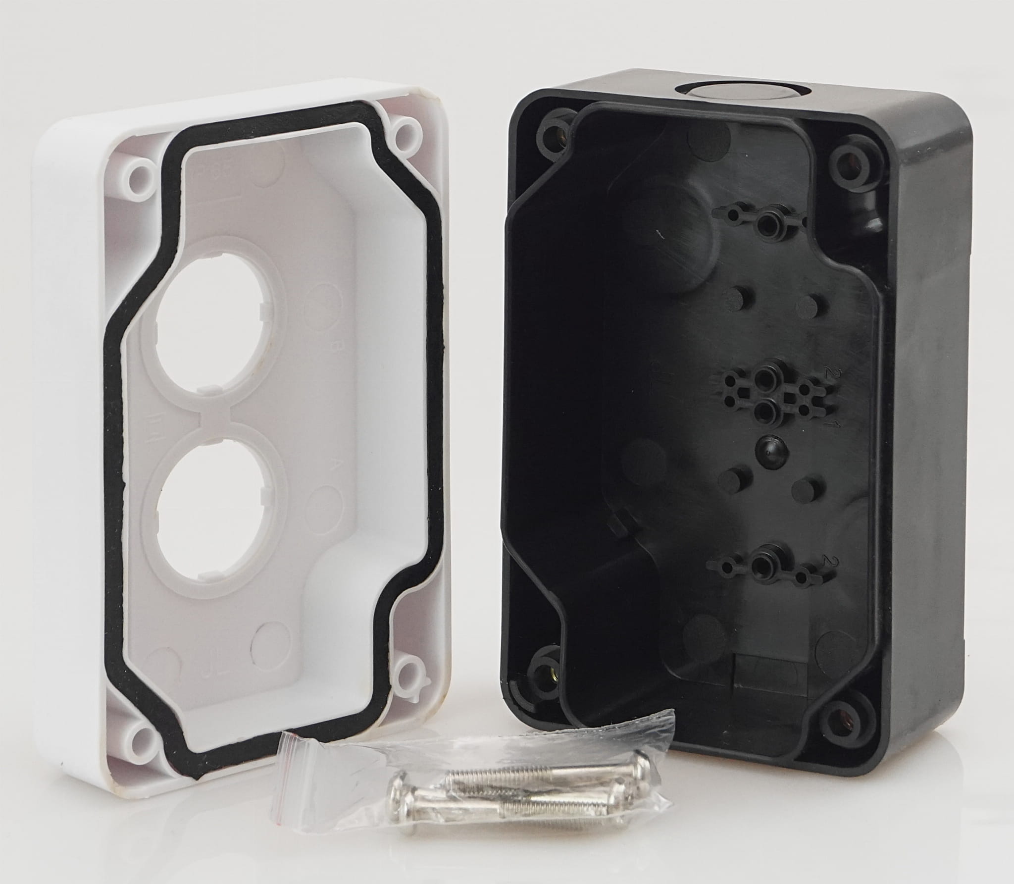 - przyciski z kołnierzem platikowym: zielony (1x styk NO), czerwony (1x styk NC)