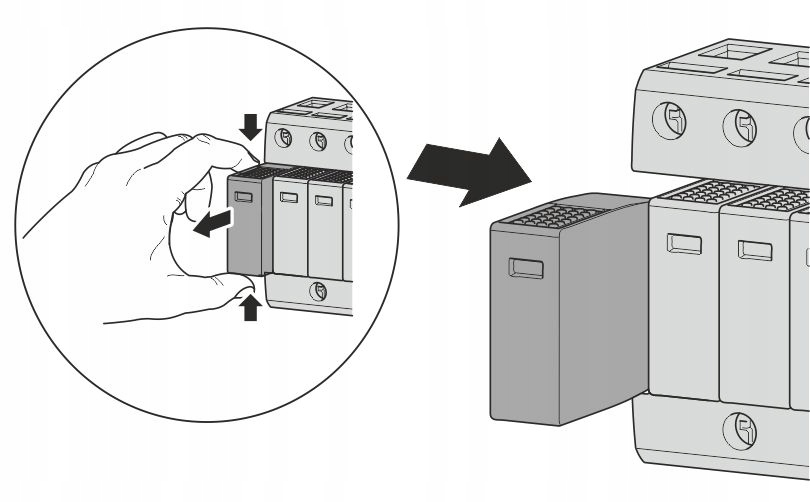 Pewne trzymanie modułów w podstawie - stabilne mocowanie umożliwia stosowanie ograniczników w aplikacjach zagrożonych wibracjami, np. w elektrowniach wiatrowych. Jednocześnie po wciśnięciu elementu unieruchamiającego, możliwe jest wyjęcie modułu z podstawy.