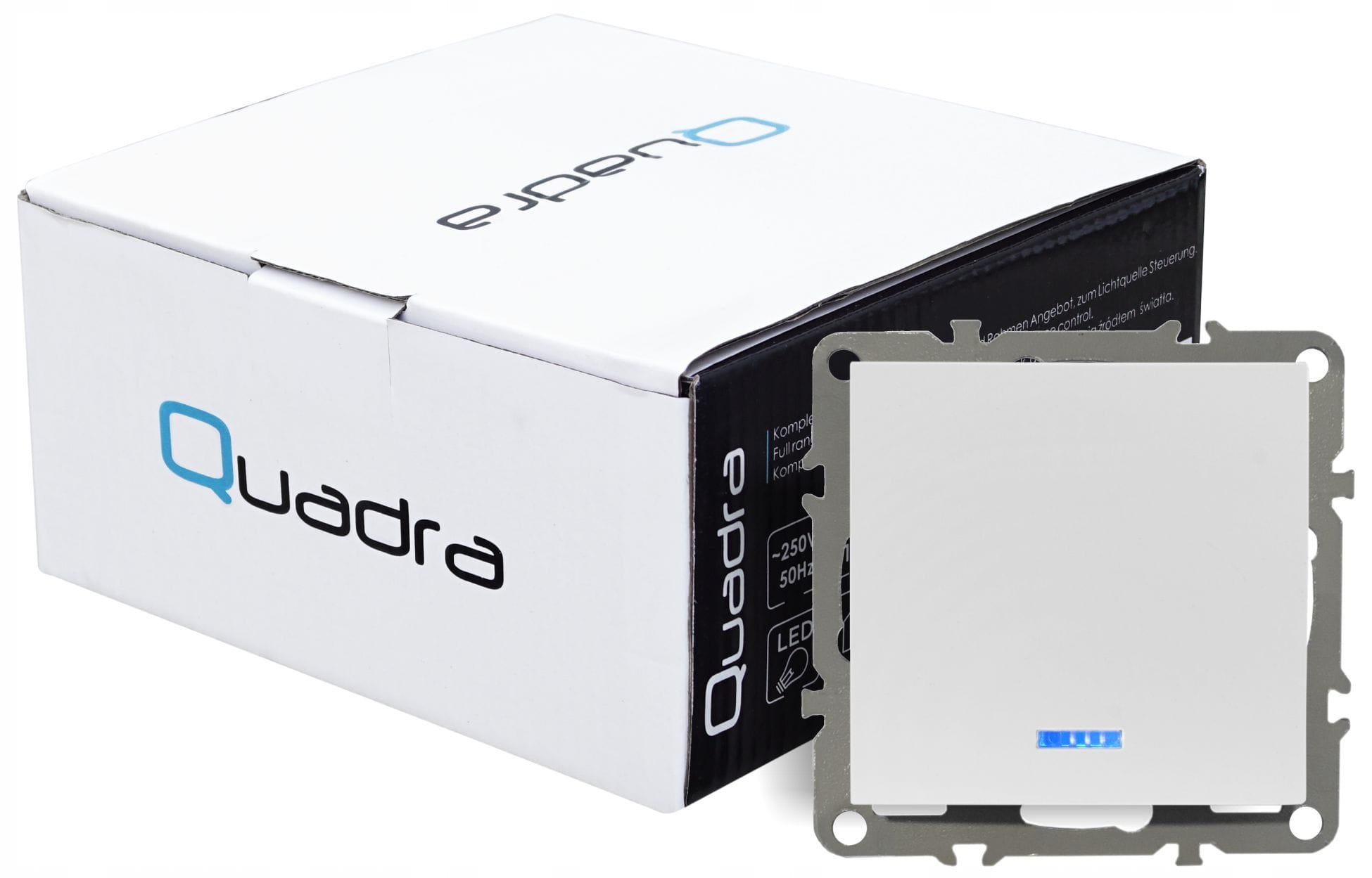 - Nowoczesne włączniki światła, gniazda oraz ramki serii Quadra, do sterowania oświetlaniem. W kolorze białym.