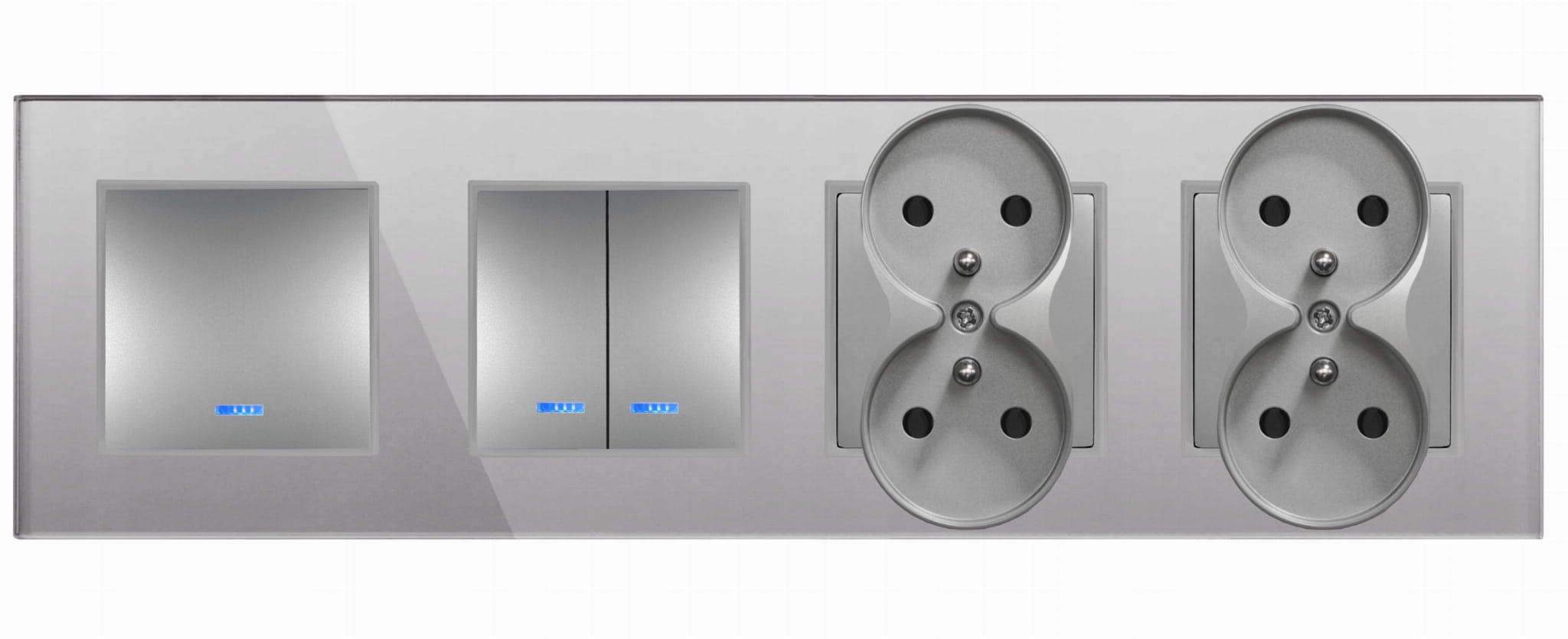 Nowoczesne, szklane włączniki światła, gniazda oraz ramki serii Quadra, do sterowania oświetlaniem. W kolorze szarym.