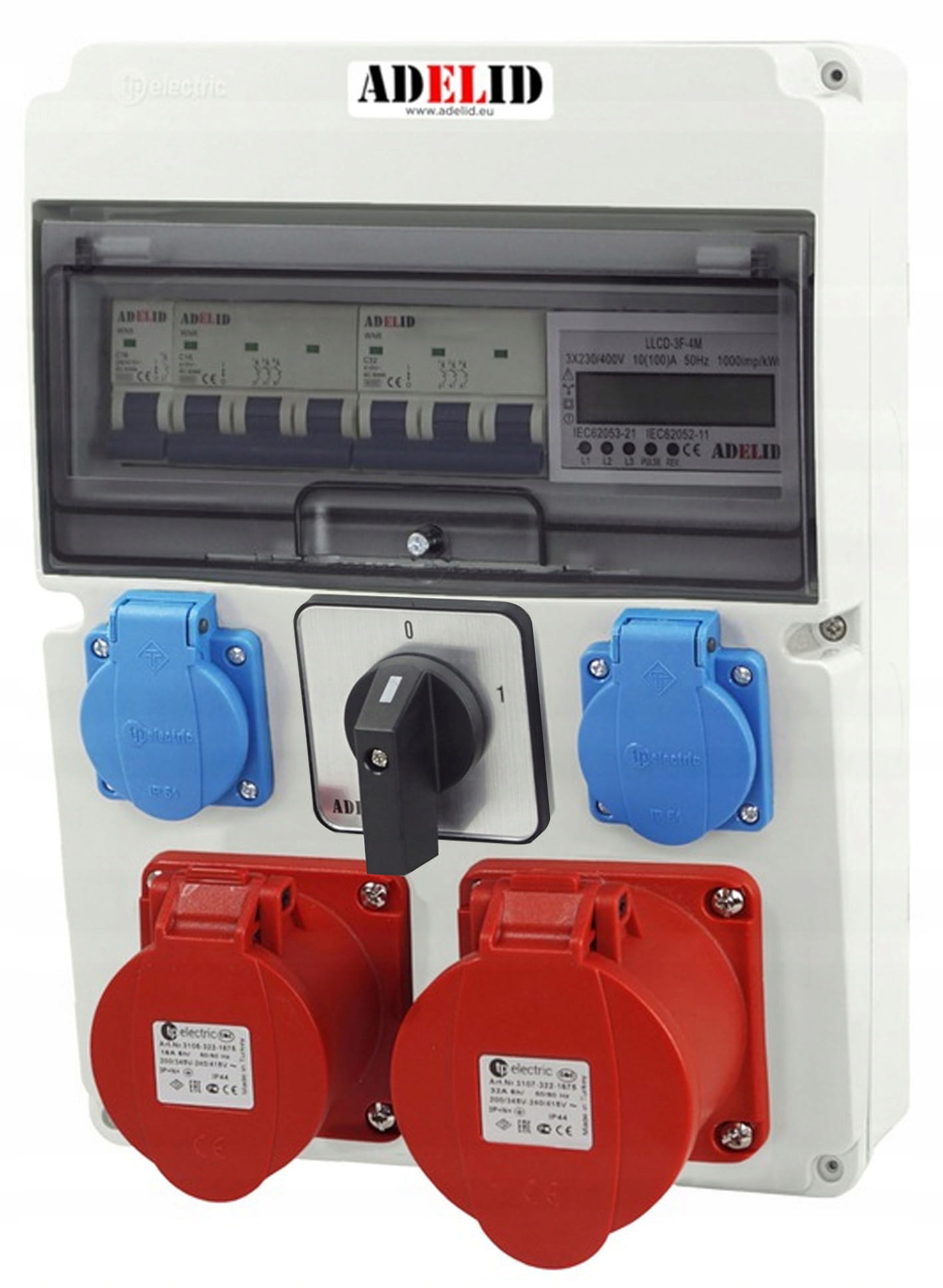 ORYGINALNA RODZIELNICA ELEKTRYCZNA, ZABEZPIECZONA, MARKI ADELID, Z GNIAZDAMI SIŁOWYMI, DWOMA GNIAZDAMI 230V, WŁĄCZNIKIEM 01 ORAZ MIERNIKIEM ENERGII.