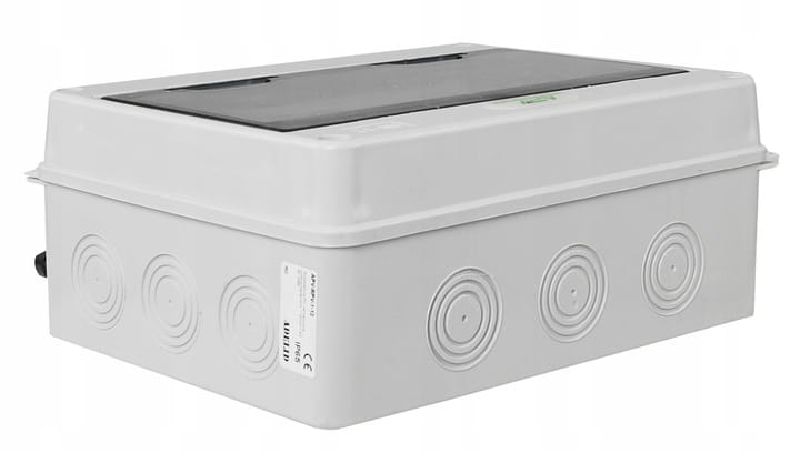 - Obudowa rozdzielnicy na 12 modułów, natynkowa, o szczelności IP65, z drzwiami transparentnymi.