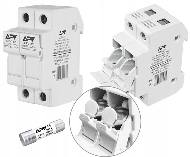 - 1x rozłącznik bezpiecznikowy APV 2P 10x38 1000V DC, z dwoma wkładkami topikowymi,