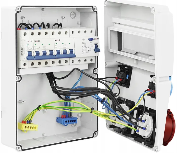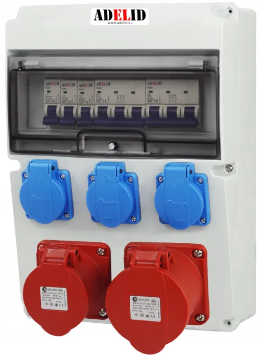 Rozdzielnica elektryczna budowlana, z bezpiecznikami, marki Adelid, z gniazdami siłowymi oraz trzema gniazdami 230V