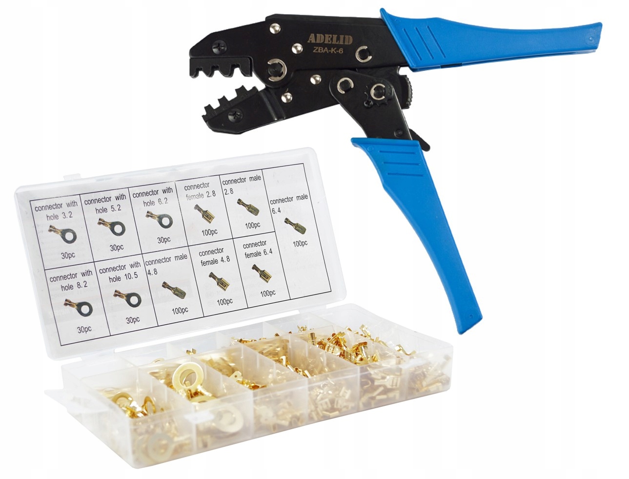 Podwójny zestaw końcówek konektorowych, nieizolowanych, męskich oraz żeńskich, oczkowych - 900 sztuk, wraz z praską Basic, marki Adelid