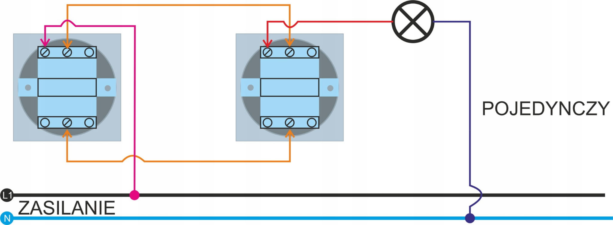 - Funkcja schodowa – pozwala sterować światłem z dwóch różnych miejsc. Idealne rozwiązanie dla korytarzy, schodów i większych przestrzeni.