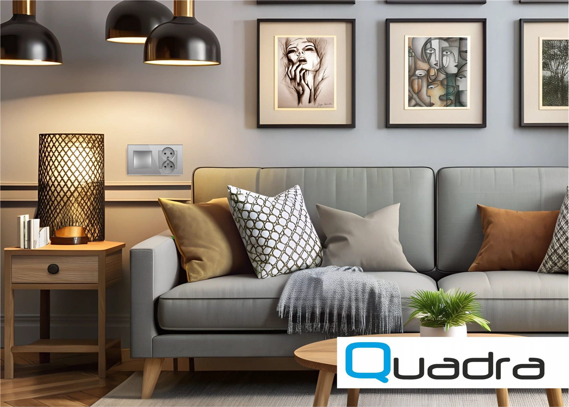 Nowoczesne włączniki światła, gniazda oraz ramki serii Quadra, do sterowania oświetleniem. W kolorze szarym.