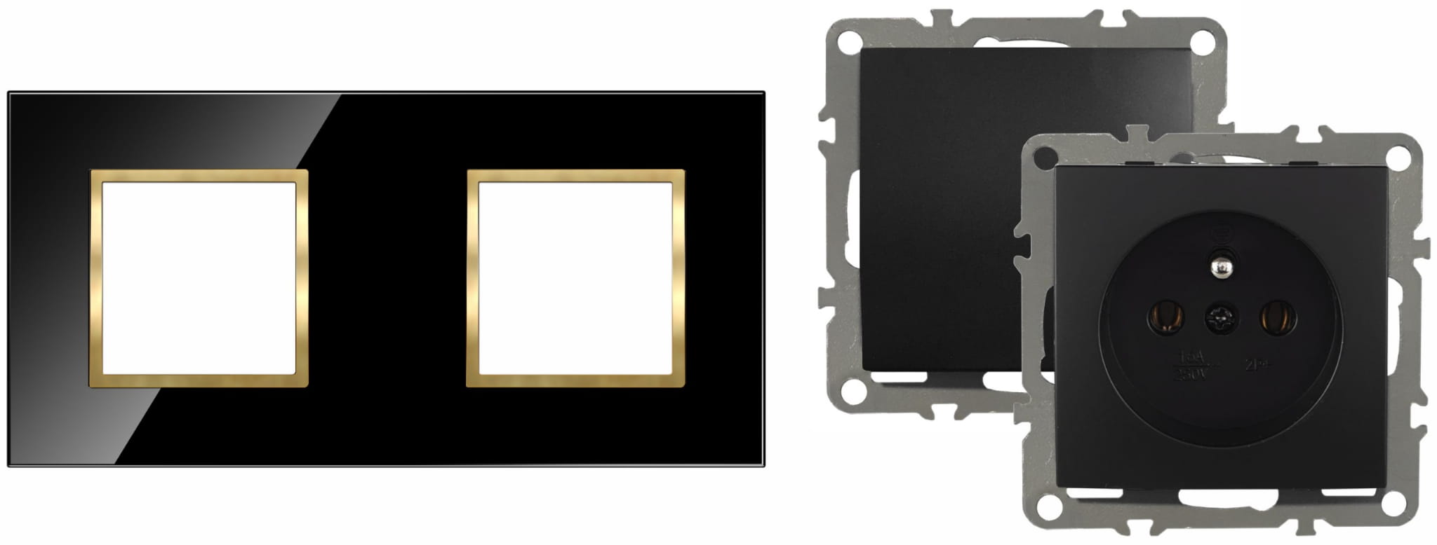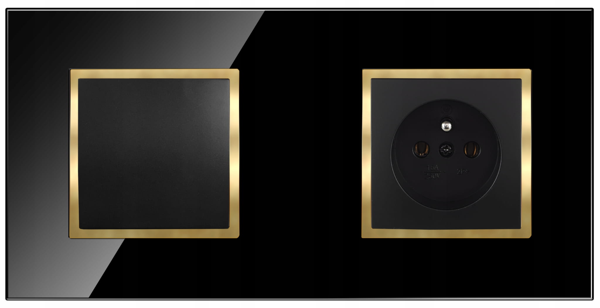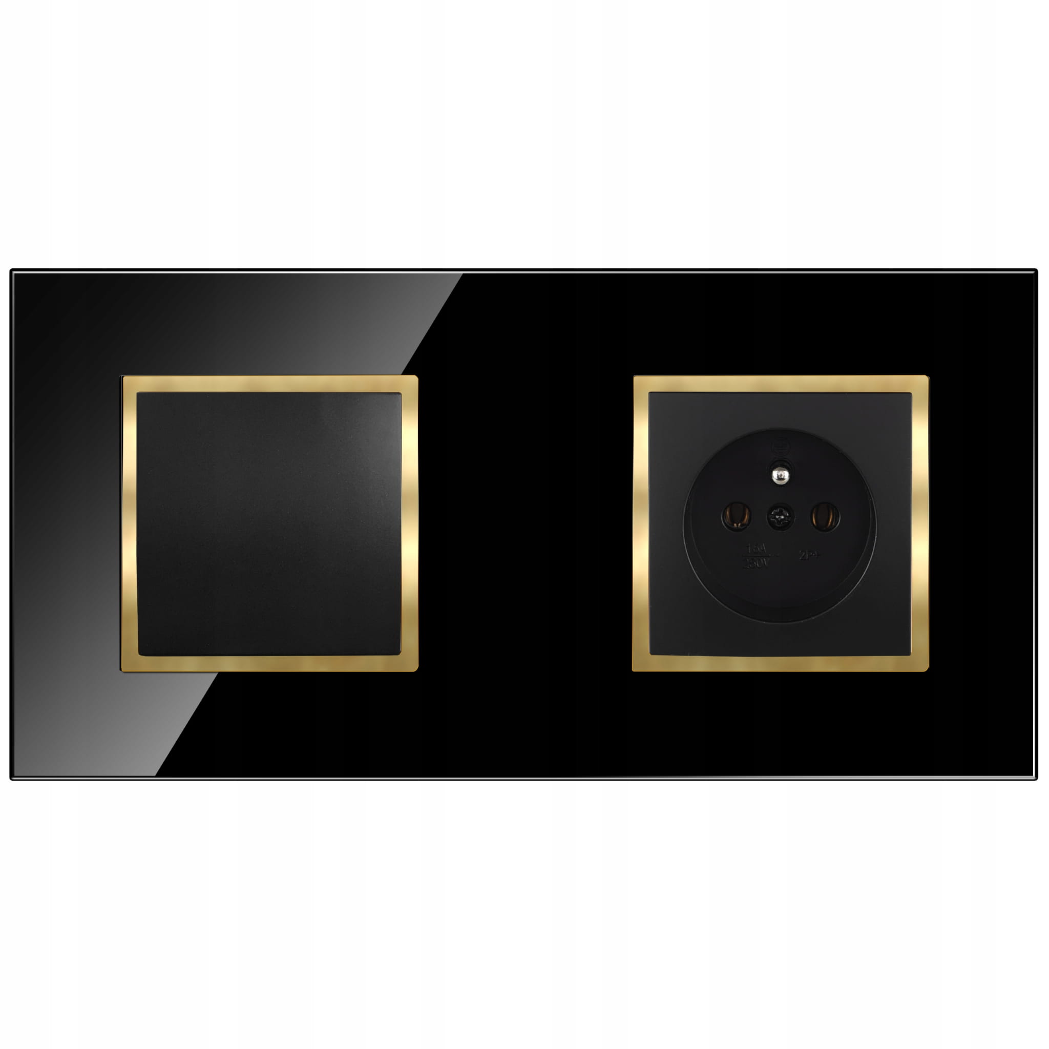 Gniazdo pojedyncze, z uziemieniem poprzez bolec, w kolorze czarnym, oraz włącznik pojedynczy, w ramce podwójnej czarnej z rantami złotymi.