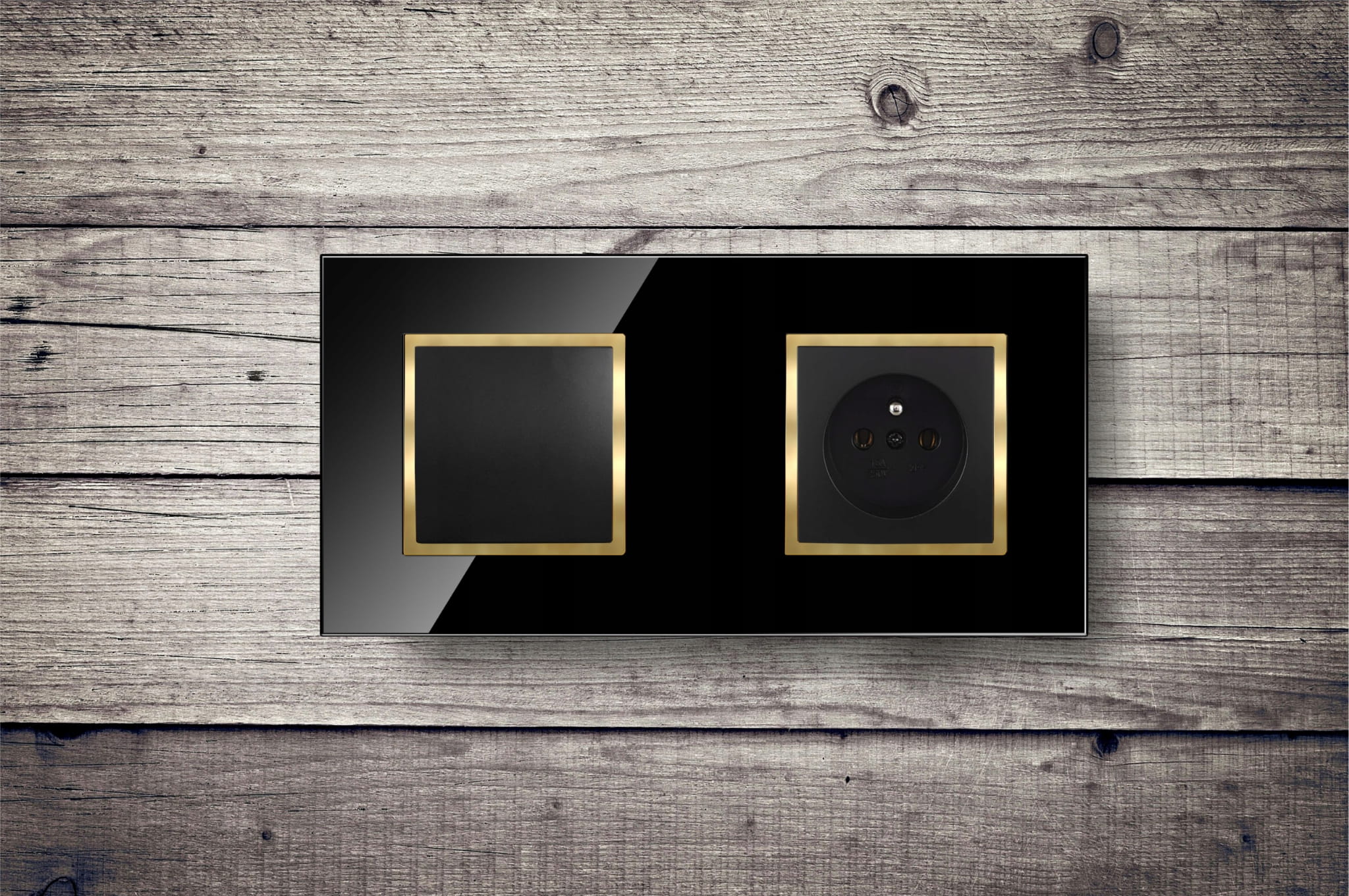 Włącznik Światła Szklany Czarny Złoty Pojedynczy Gniazdko Z Bolcem QUADRA
