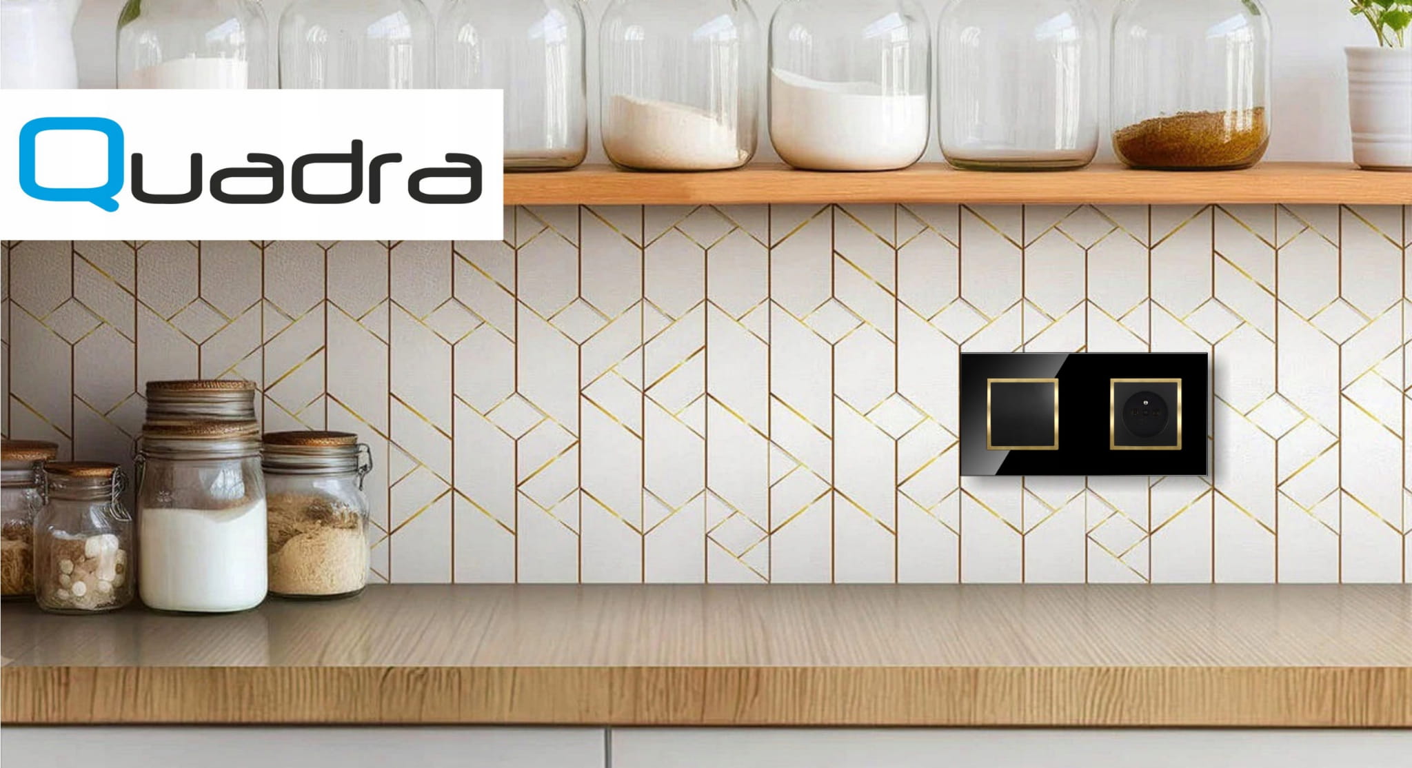 Nowoczesne włączniki światła, gniazda oraz ramki serii Quadra, do sterowania oświetleniem. W kolorze czarnym.