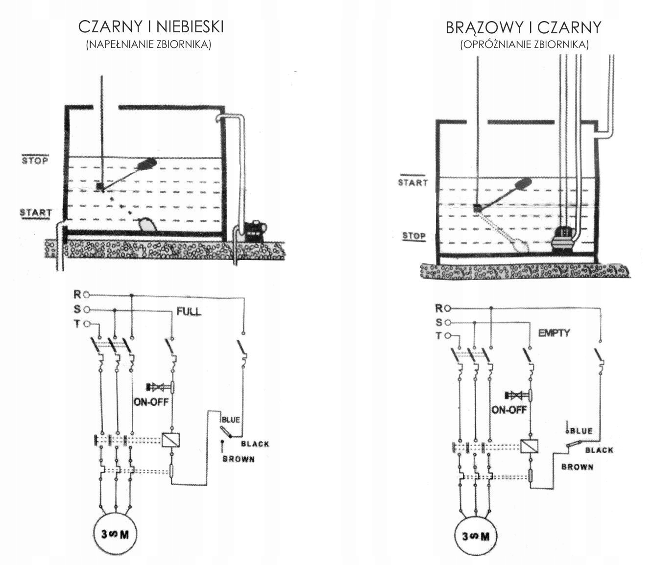 Wyłącznik pływakowy ma dwie funkcje: wypompowywania oraz napełniania.
