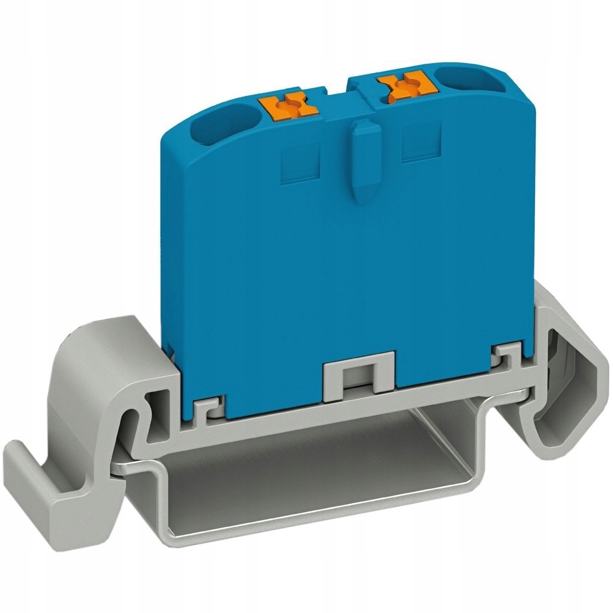 Blok rozdzielczy BRX 2x2,5 BU wraz z podstawą/adapterem na szynę DIN, marki ADELID, w kolorze niebieskim.