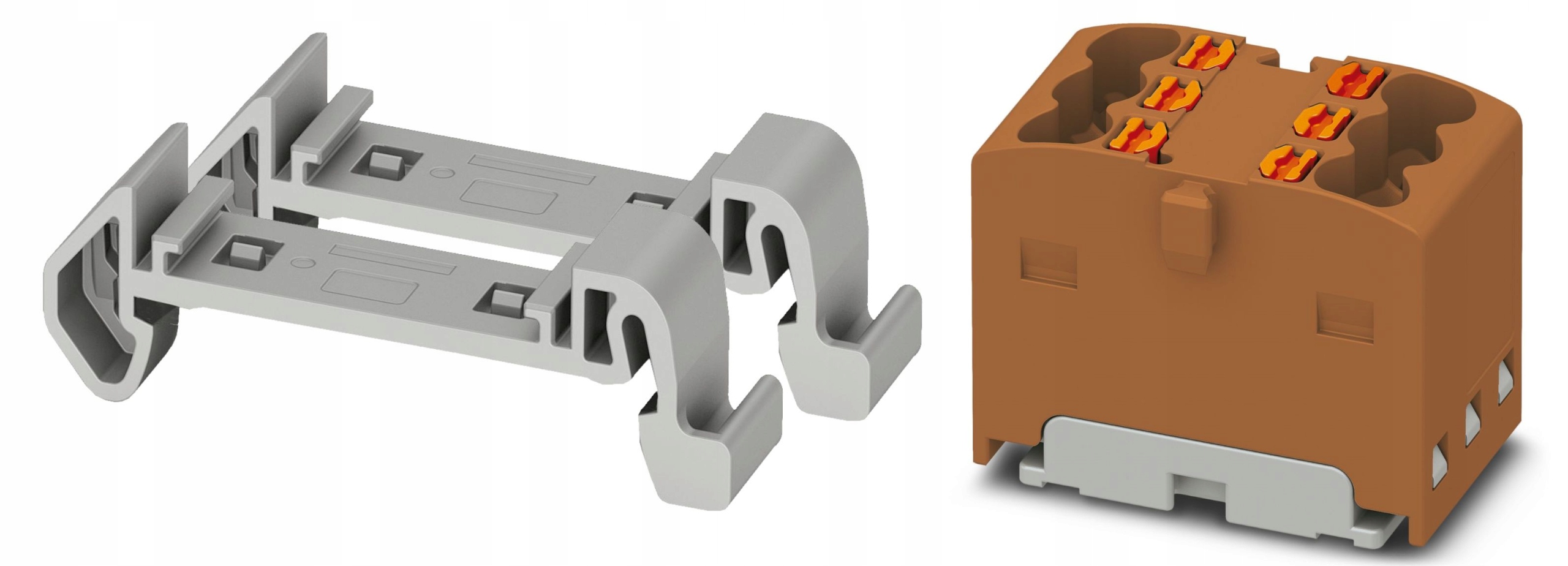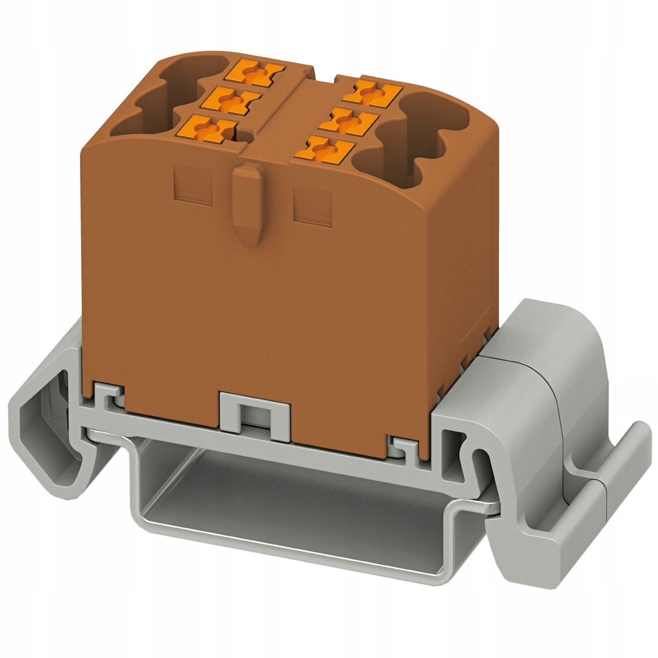 Blok rozdzielczy BRX 6x2,5 BN wraz z podstawą/adapterem na szynę DIN, marki ADELID, w kolorze brązowym.