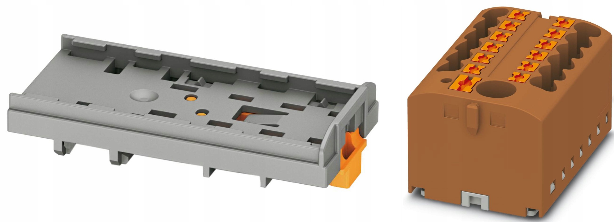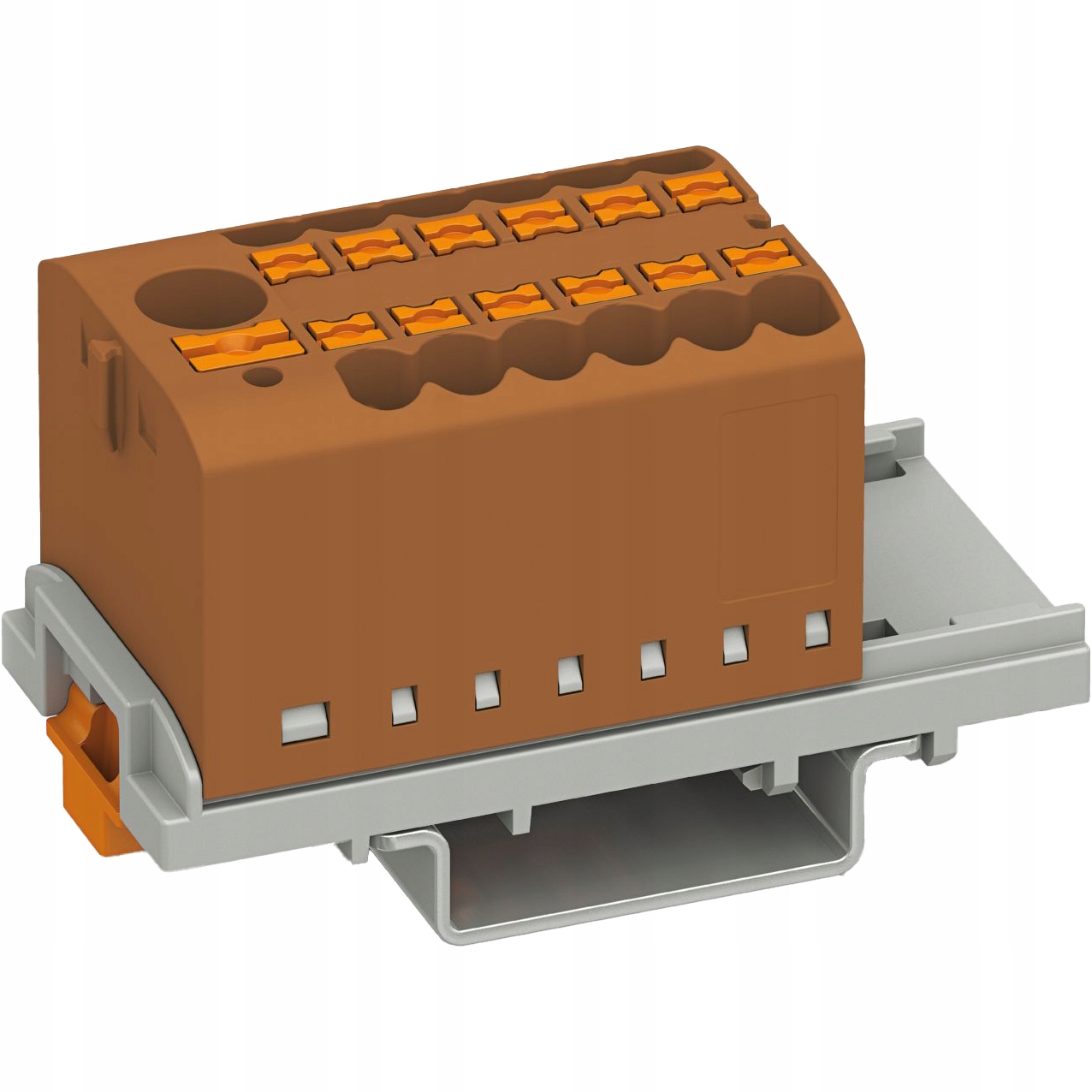 Blok rozdzielczy BRX 6/12x2,5 BN wraz z podstawą/adapterem na szynę DIN, marki ADELID, w kolorze brązowym.