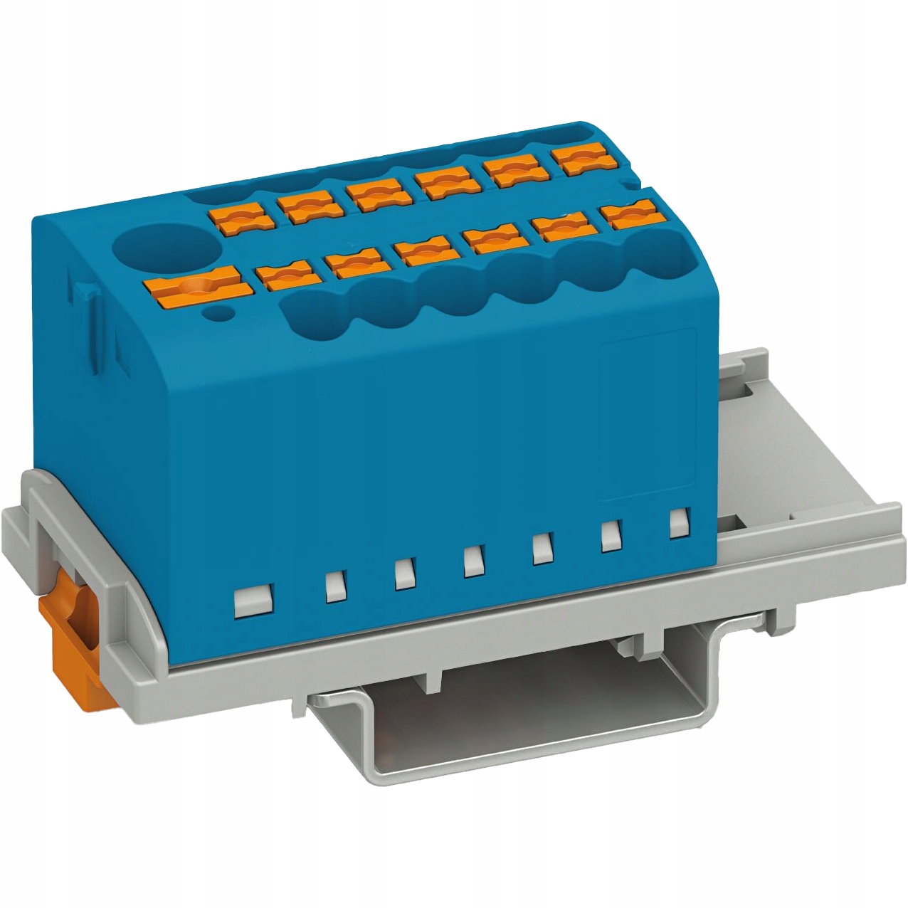Blok rozdzielczy BRX 6/12x2,5 BU wraz z podstawą/adapterem na szynę DIN, marki ADELID, w kolorze niebieskim.