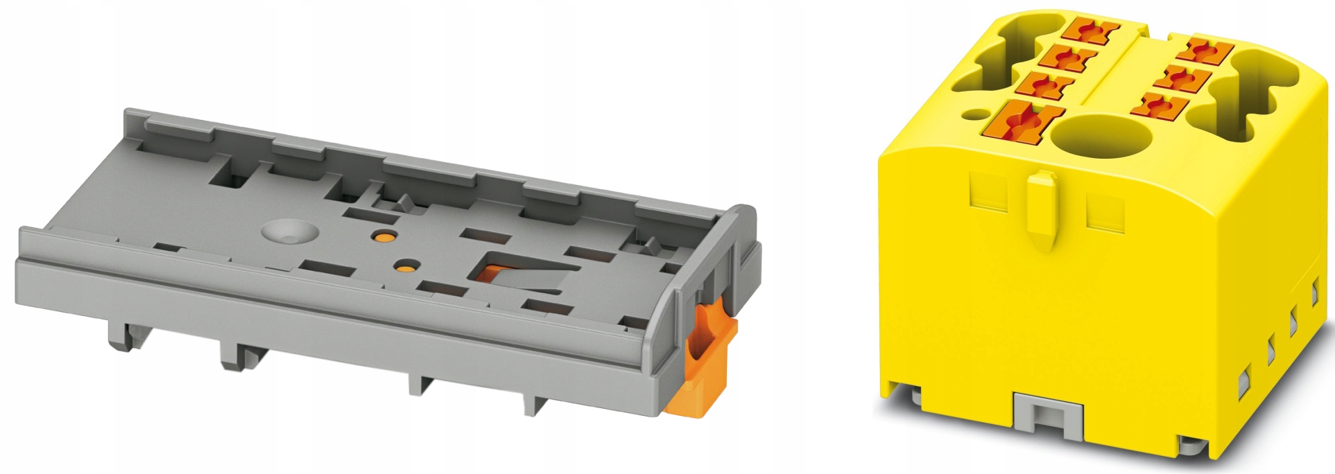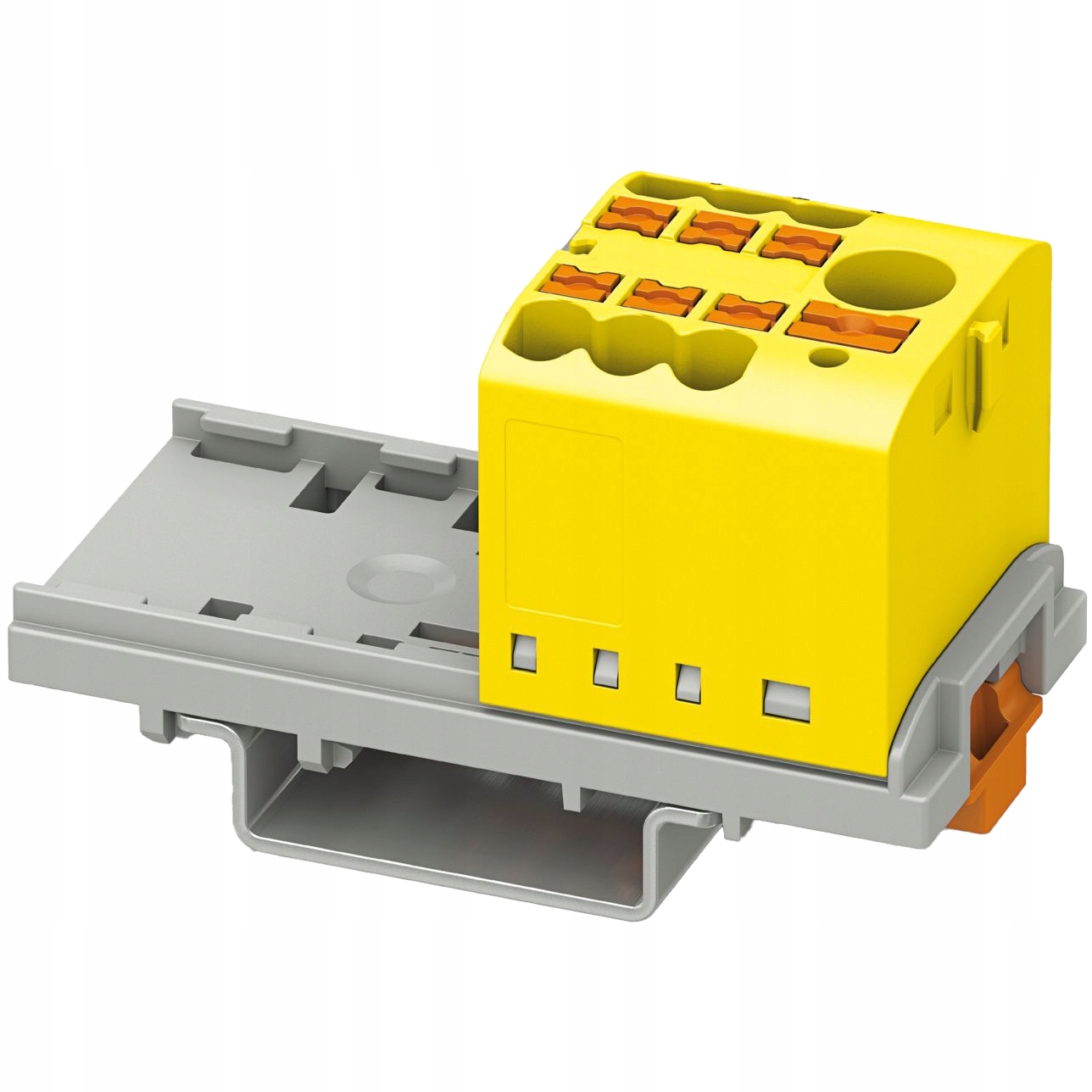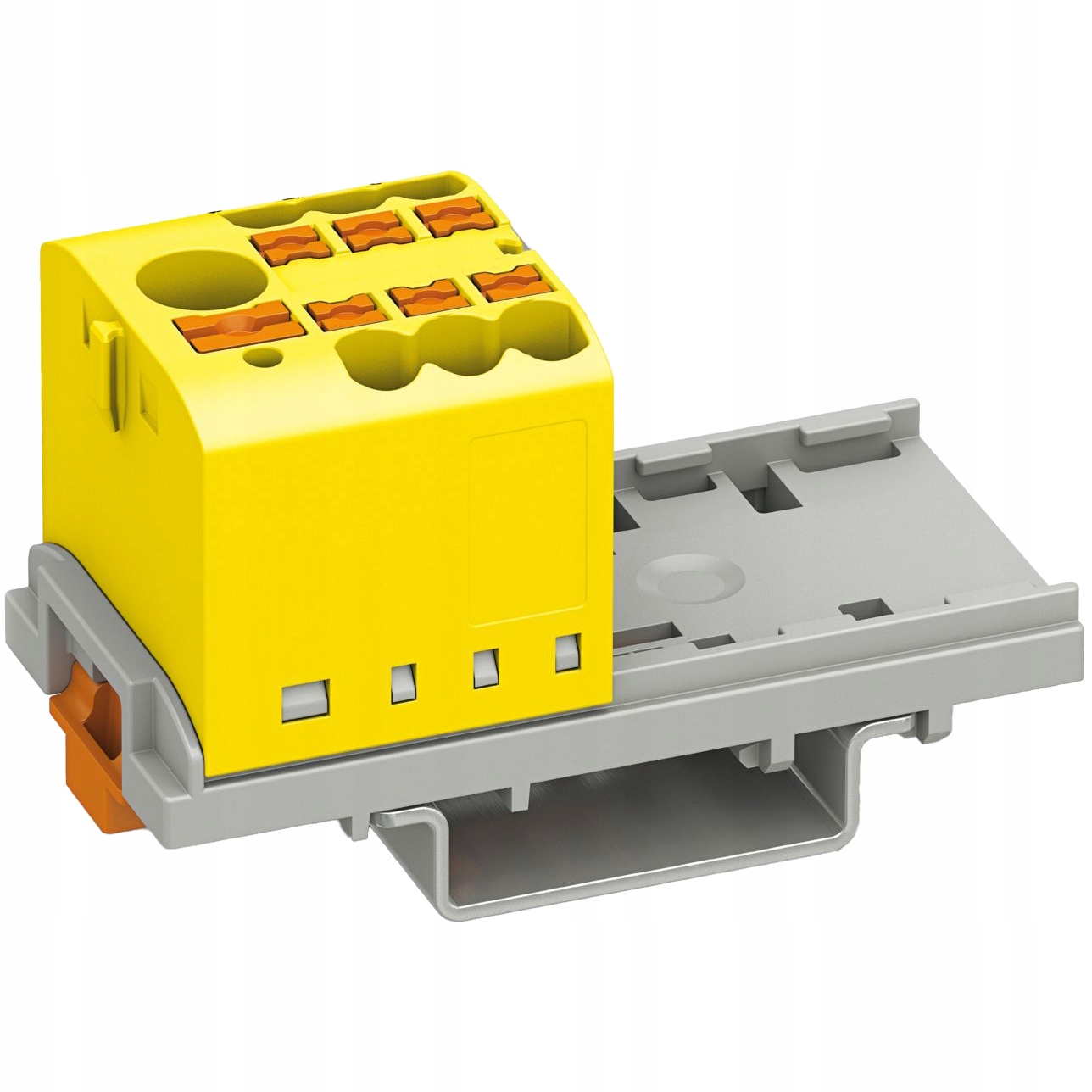 Blok rozdzielczy BRX 6/6x2,5 YE wraz z podstawą/adapterem na szynę DIN, marki ADELID, w kolorze żółtym.
