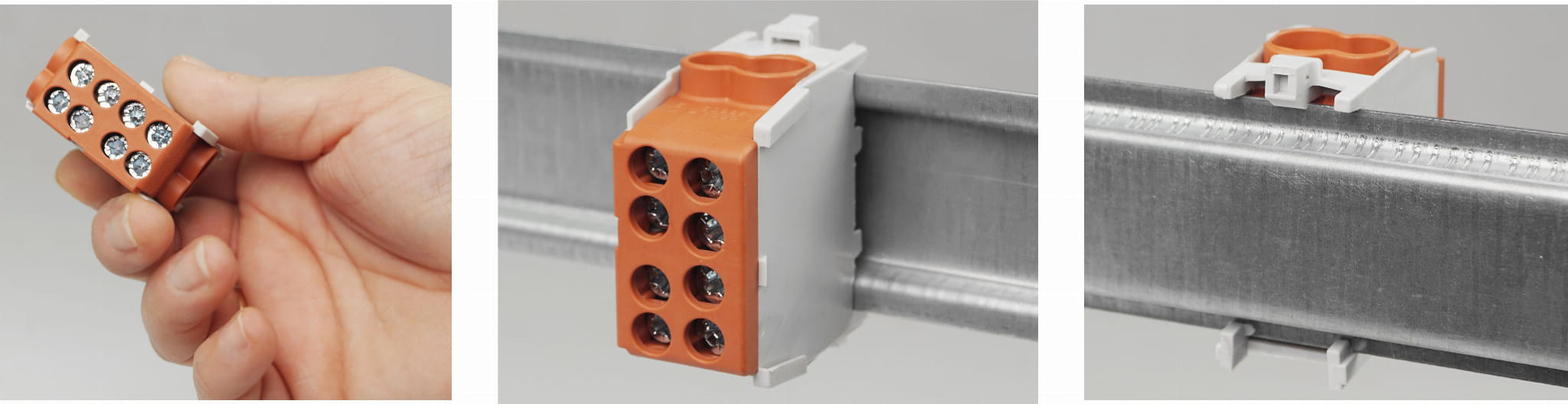- Zacisk montowany jest na szynie TS/TH35 i ma możliwość łączenia modułowego.