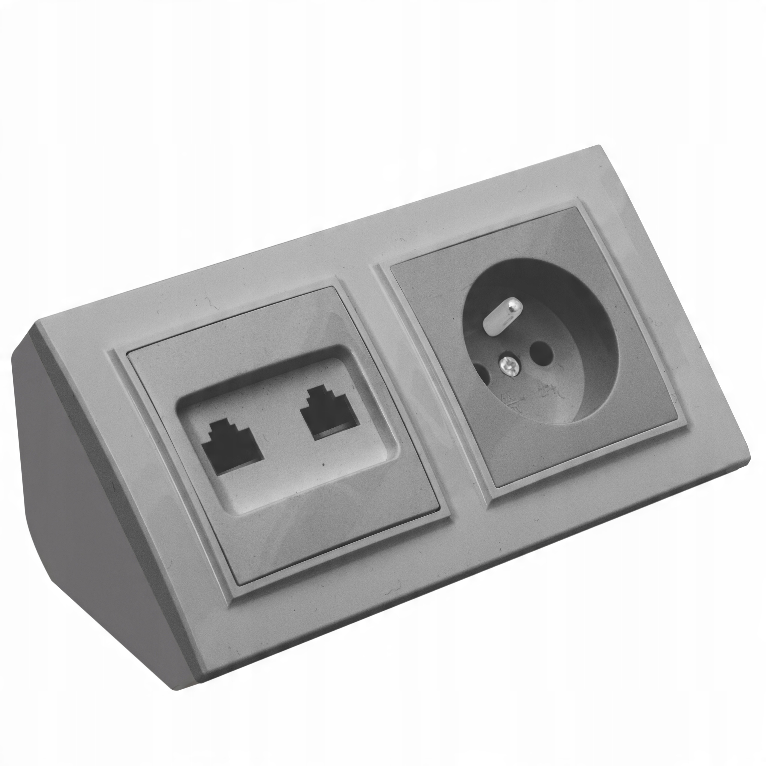 - Rodzaj: gniazdko z uziemieniem oraz gniazdko komputerowe RJ45 X2, w ramce plastikowej szarej, w puszce podwójnej, narożnej,