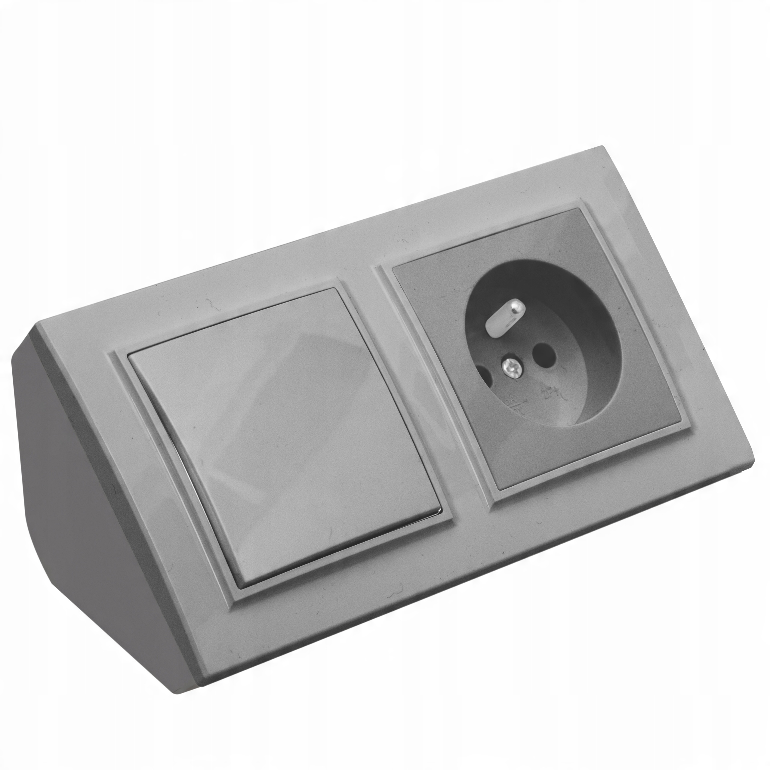 - Rodzaj: gniazdko z uziemieniem oraz wyłącznik pojedynczy, w ramce plastikowej szarej, w puszce podwójnej, narożnej,