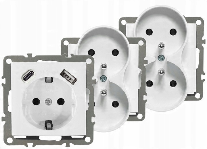 - Rodzaj: gniazdko z uziemieniem oraz USB typ C, w ramce plastikowej białej, w puszce potrójnej, narożnej,