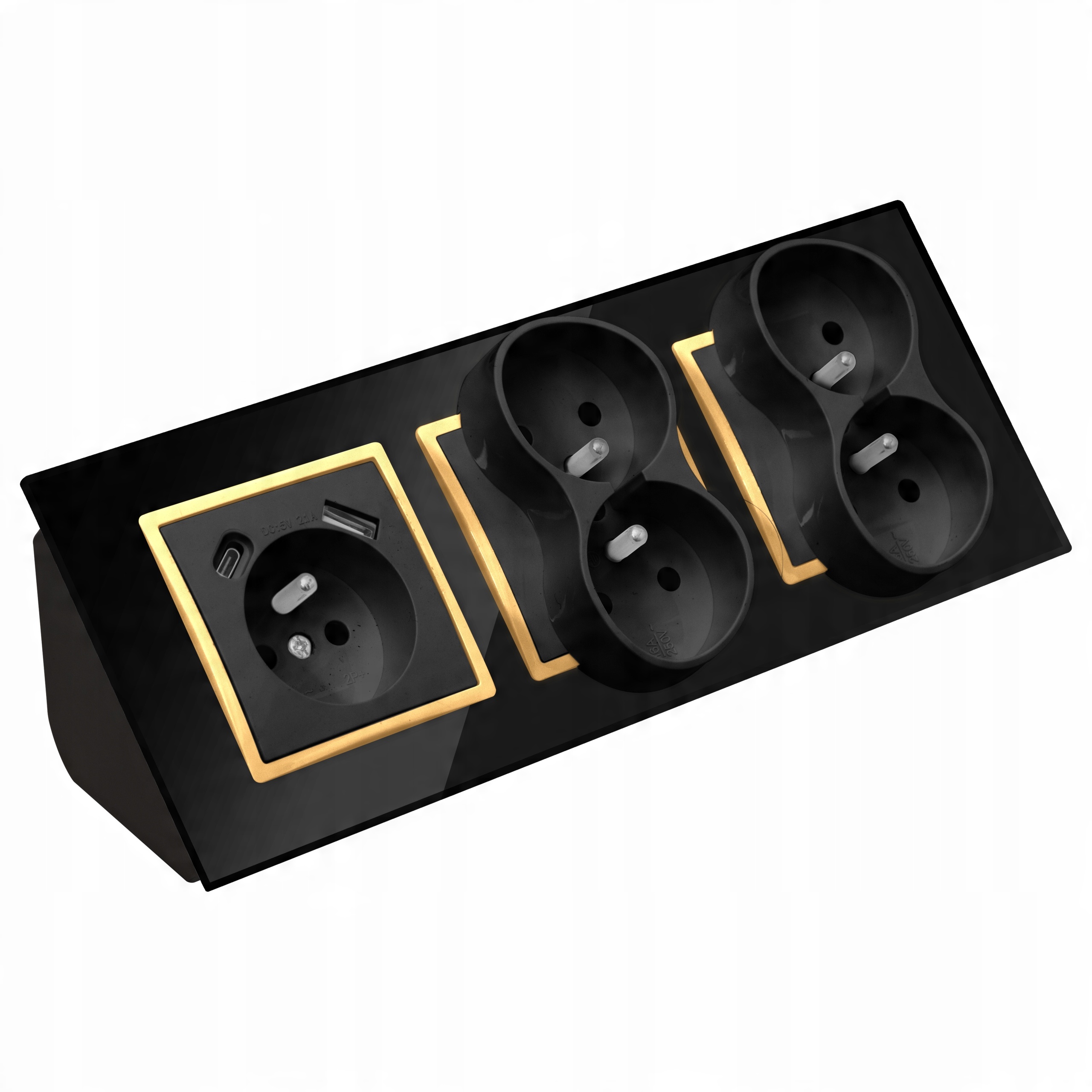 GNIAZDO PIĘCIOKROTNE SZKLANE MEBLOWE NAROŻNE USB TYP C CZARNE ZŁOTE LISTWA