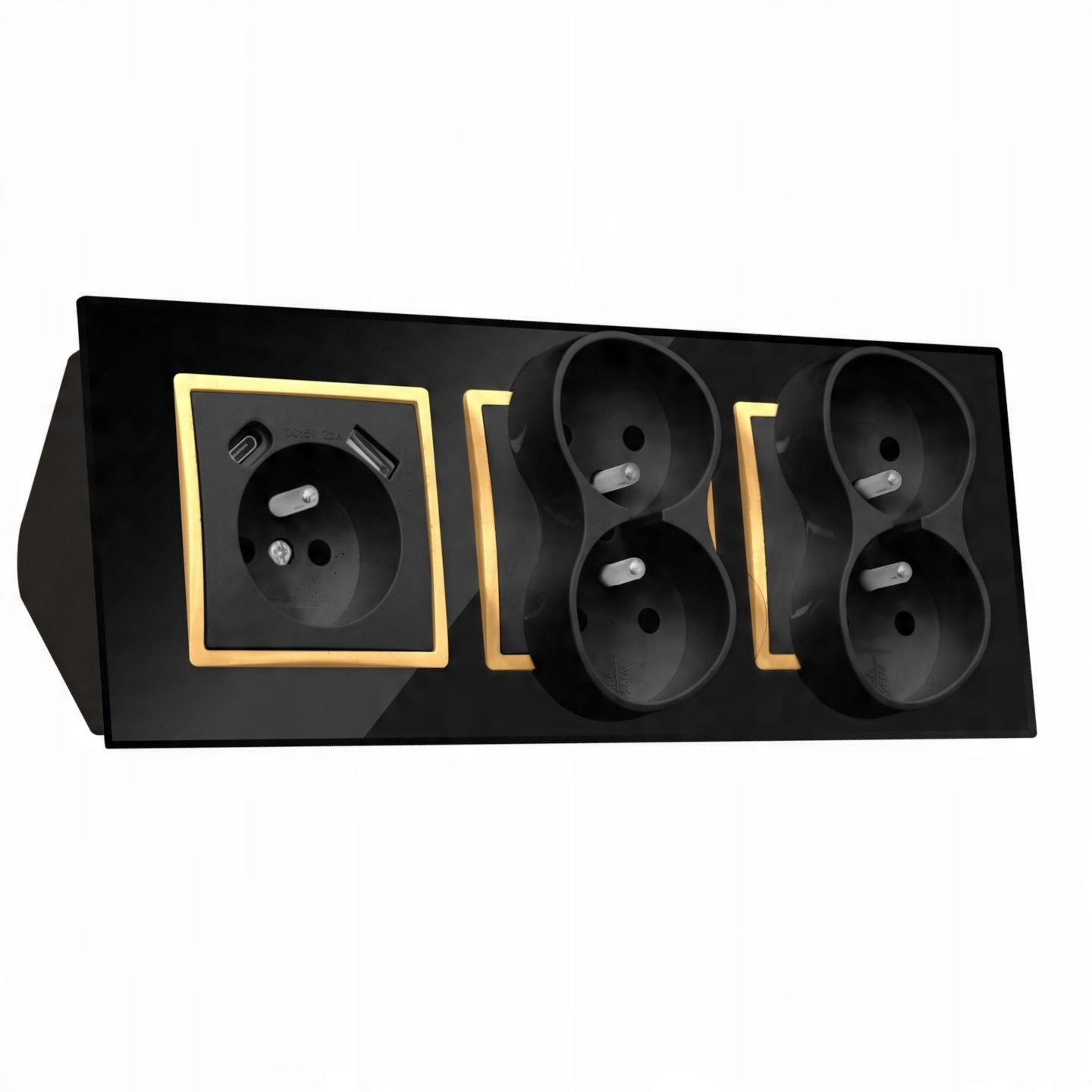 Gniazdo szklane, pięciokrotne, nablatowe, czarne złote-kuchenne, meblowe, biurkowe z USB typ C.