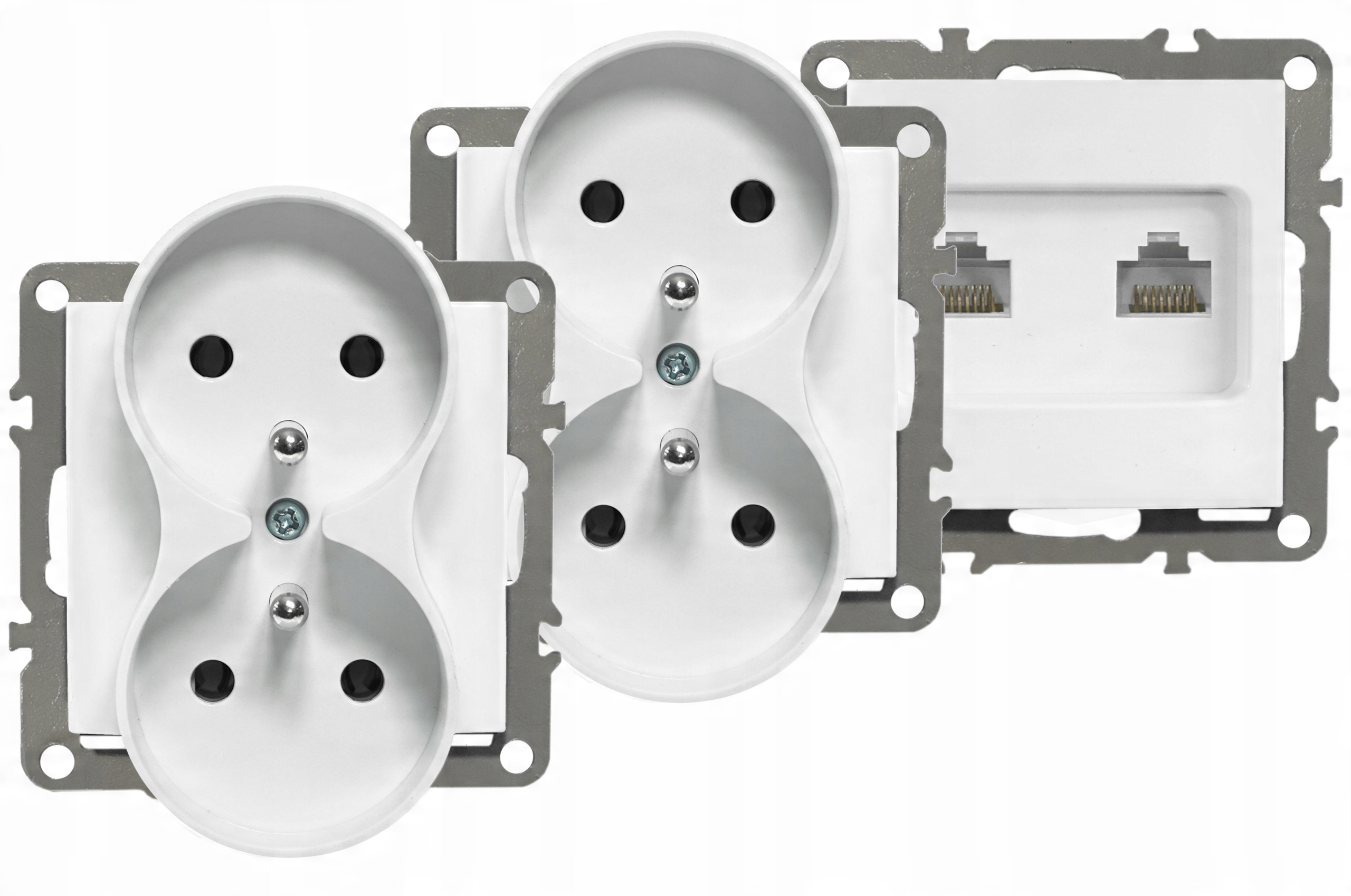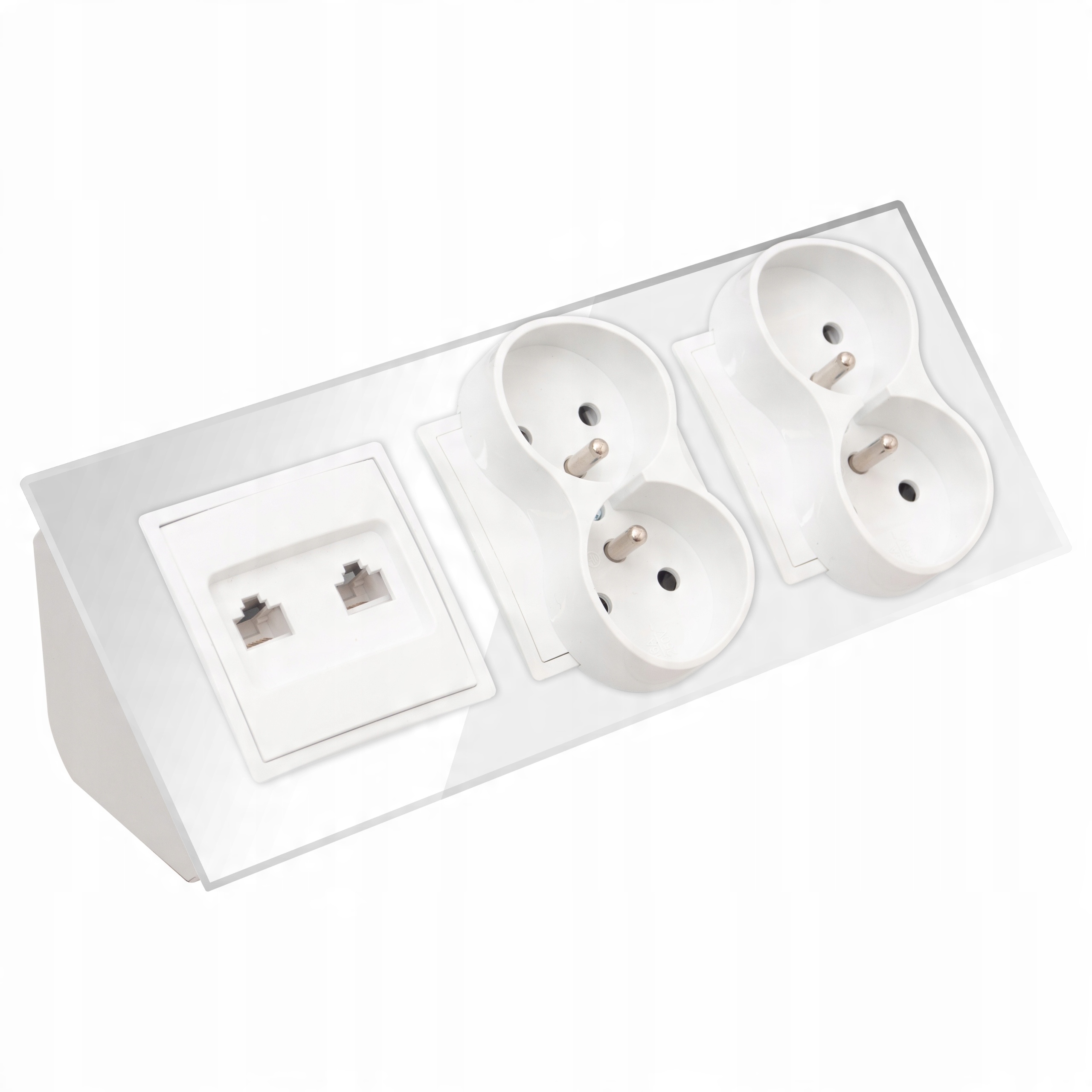 - Rodzaj: 2x gniazdko z uziemieniem i gniazdo komputerowe RJ45, w ramce szklanej białej, w puszce potrójnej, narożnej,