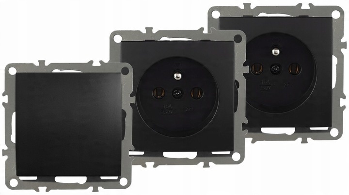 - Rodzaj: gniazdko z uziemieniem oraz wyłącznik pojedynczy, w ramce plastikowej czarnej, w puszce potrójnej, narożnej,