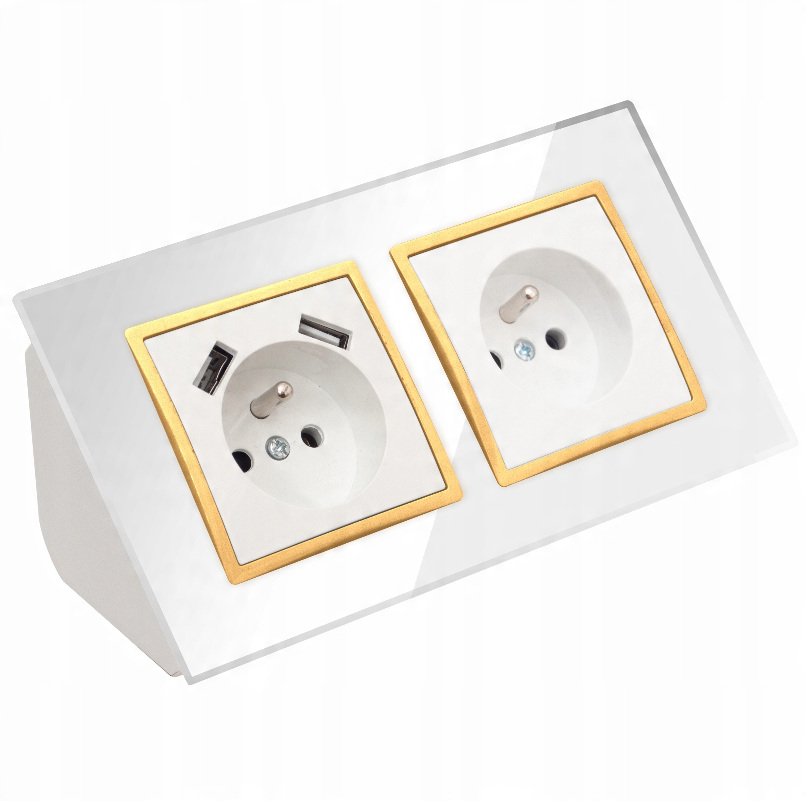 Gniazdo szklane, podwójne, nablatowe, białe złote-kuchenne, meblowe, biurkowe z USBX2.