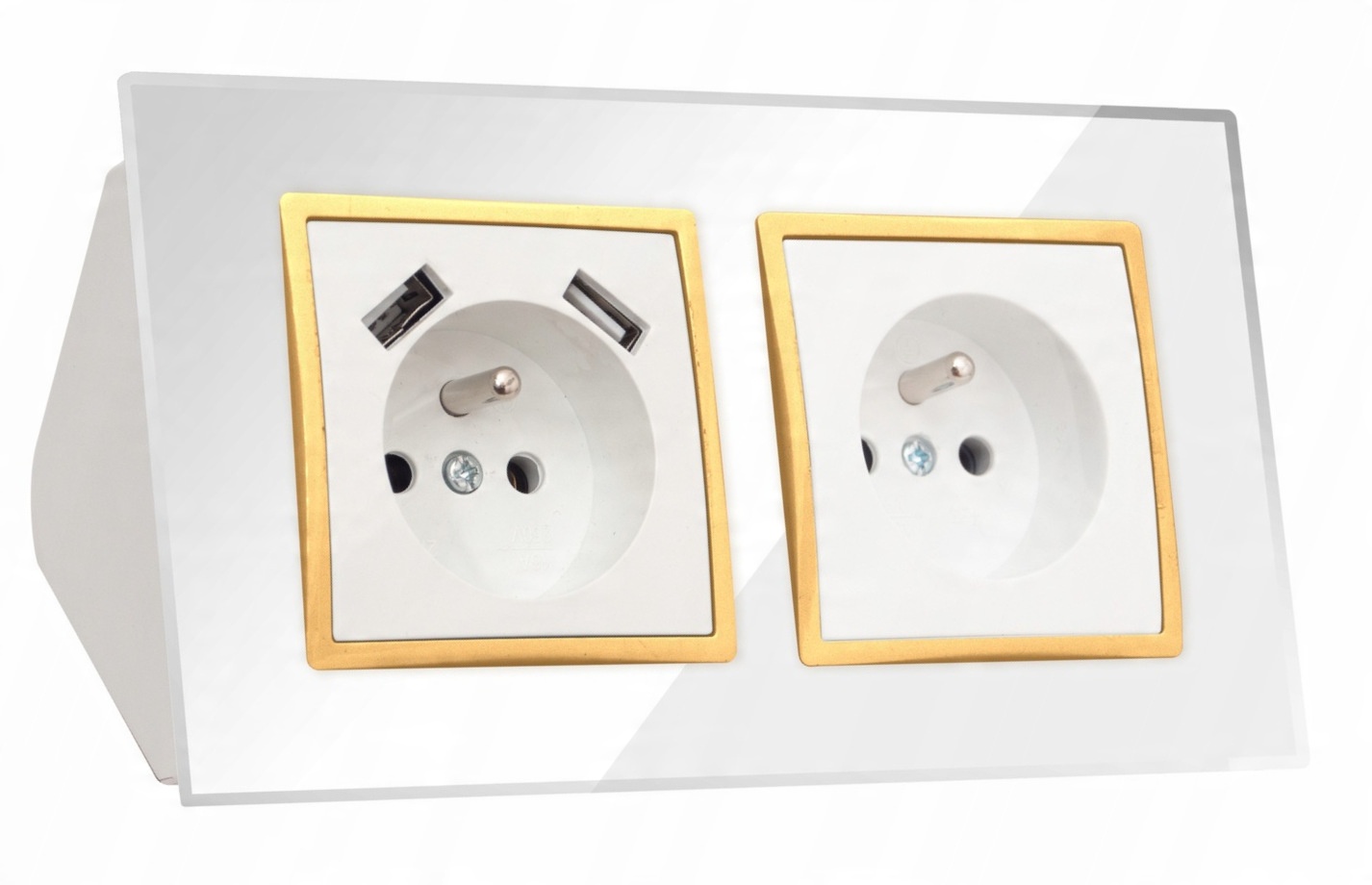 Eleganckie, podwójne gniazdo elektryczne z USBX2 z nowoczesnym szklanym panelem w biało-złotym kolorze. Idealnie sprawdzi się w każdym wnętrzu – od nowoczesnych mieszkań po biura. Zapewnia nie tylko funkcjonalność, ale również stylowy wygląd. Wysoka jakość wykonania gwarantuje trwałość i bezpieczeństwo użytkowania.