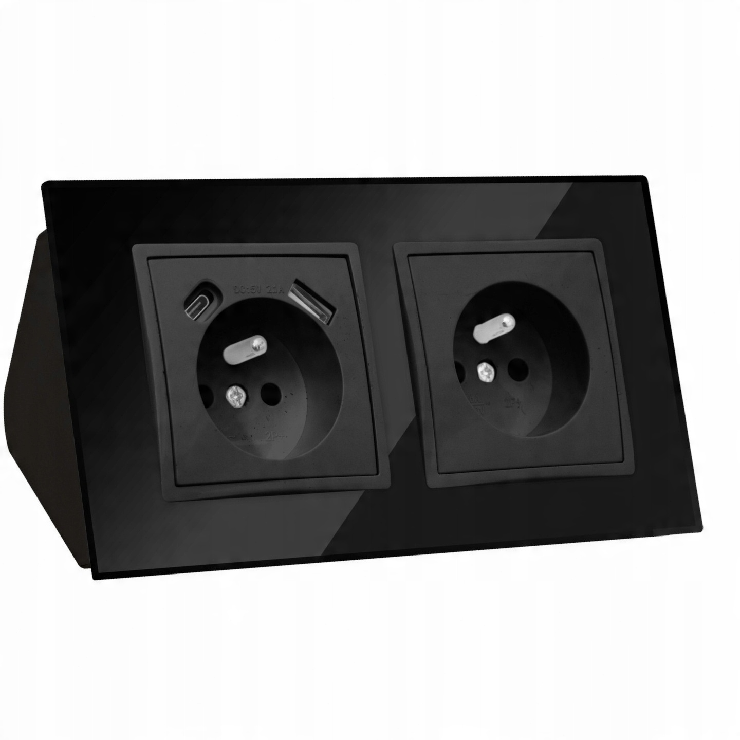 Eleganckie, podwójne gniazdo elektryczne z USB typ C z nowoczesnym szklanym panelem w czarnym kolorze. Idealnie sprawdzi się w każdym wnętrzu – od nowoczesnych mieszkań po biura. Zapewnia nie tylko funkcjonalność, ale również stylowy wygląd. Wysoka jakość wykonania gwarantuje trwałość i bezpieczeństwo użytkowania.