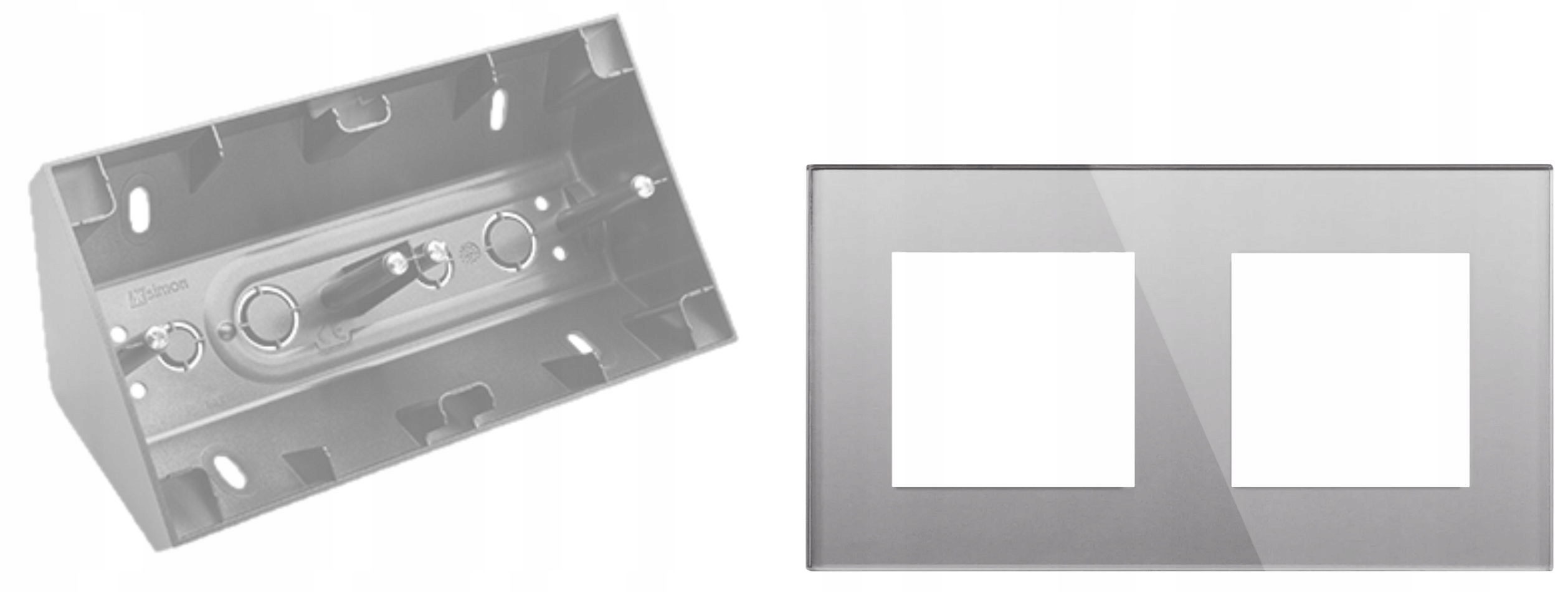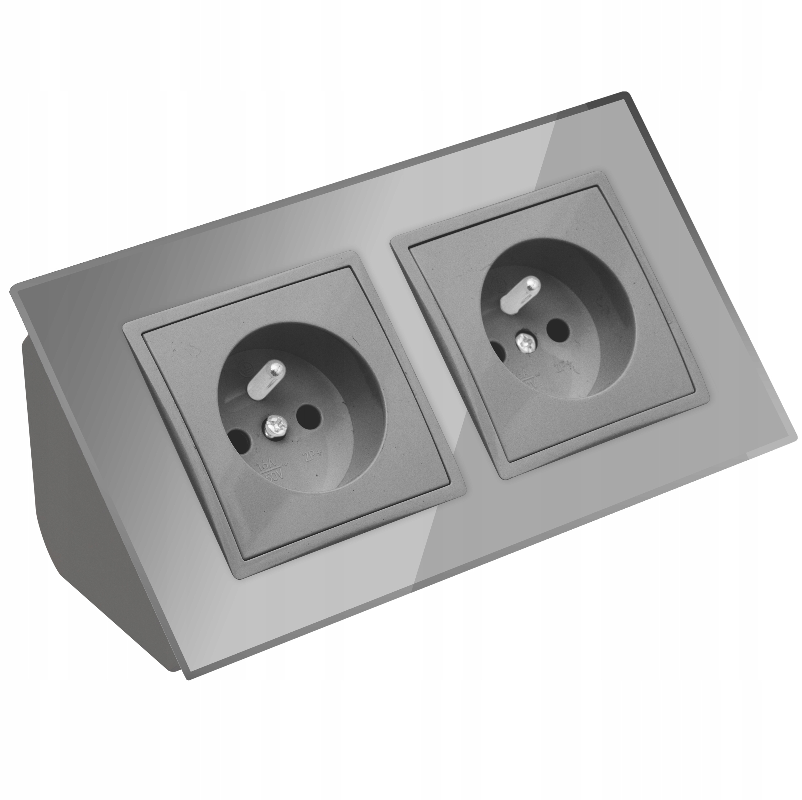 - Rodzaj: gniazdko z uziemieniem, w ramce szklanej szarej, w puszce podwójnej, narożnej,