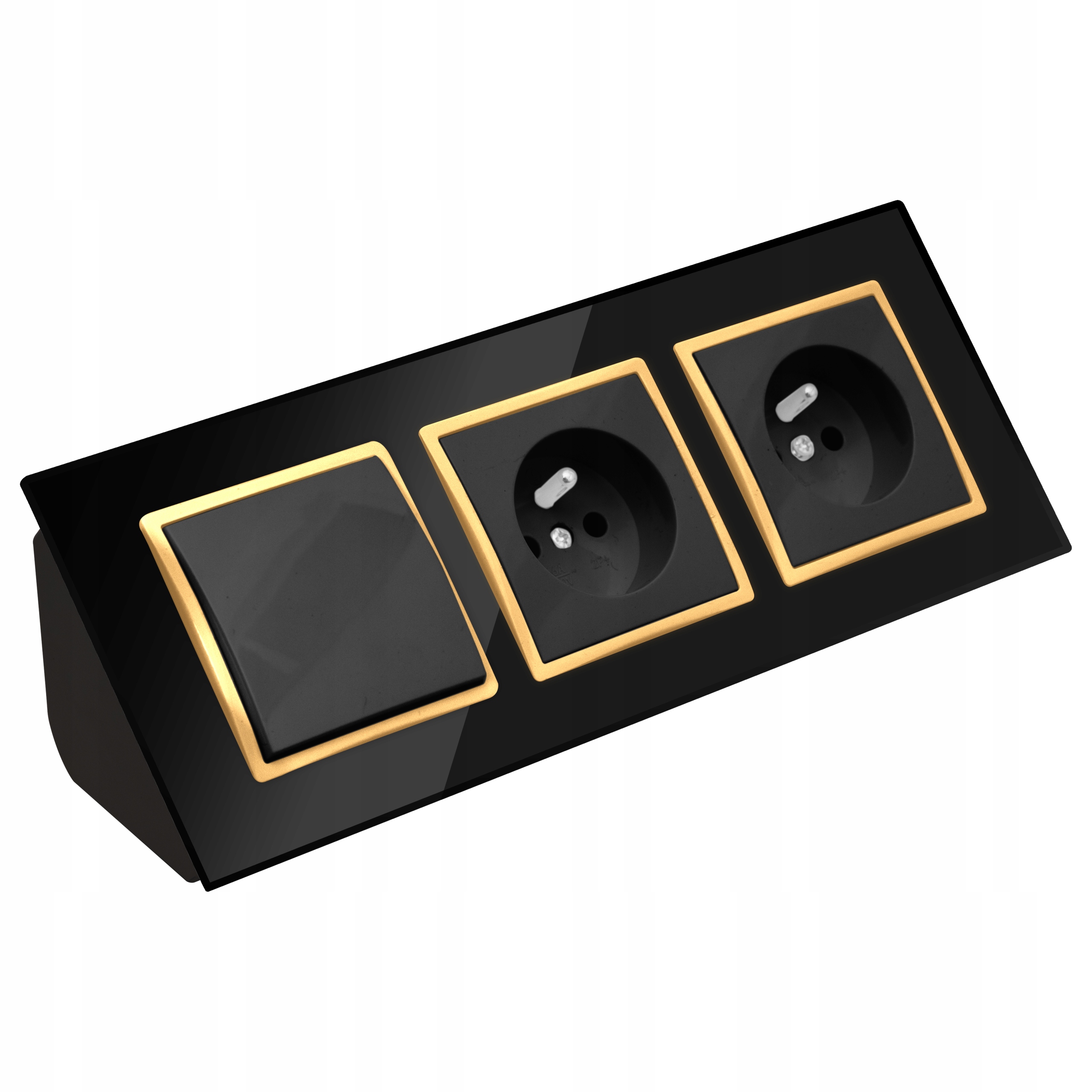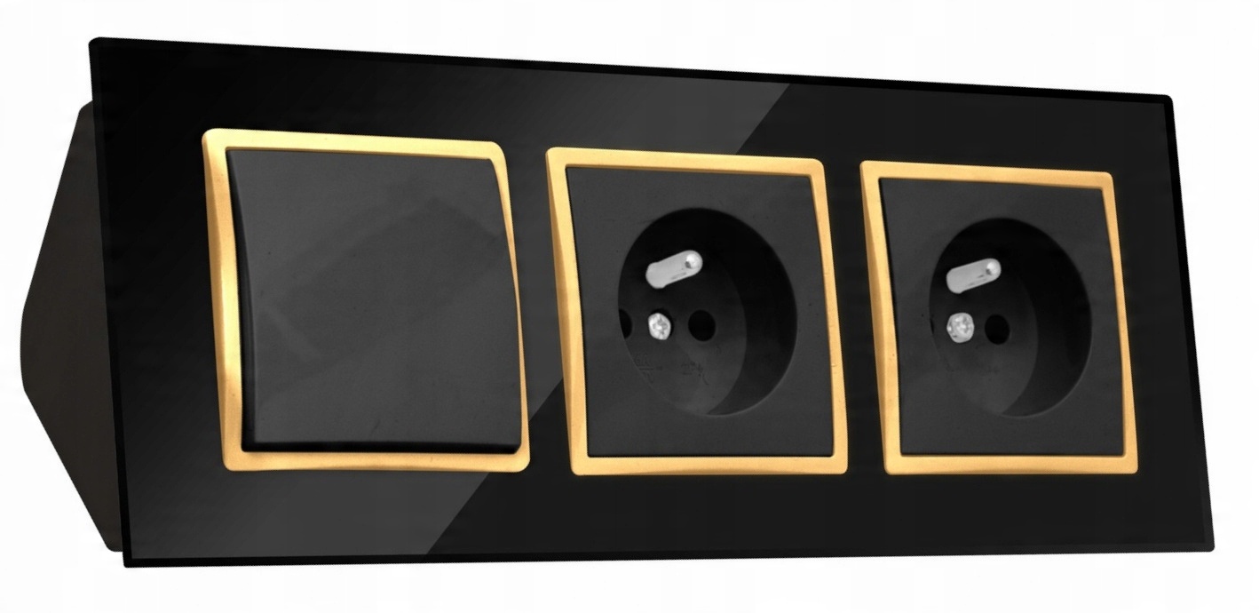 GNIAZDO PODWÓJNE SZKLANE MEBLOWE NAROŻNE Z WYŁĄCZNIKIEM CZARNE ZŁOTE LISTWA