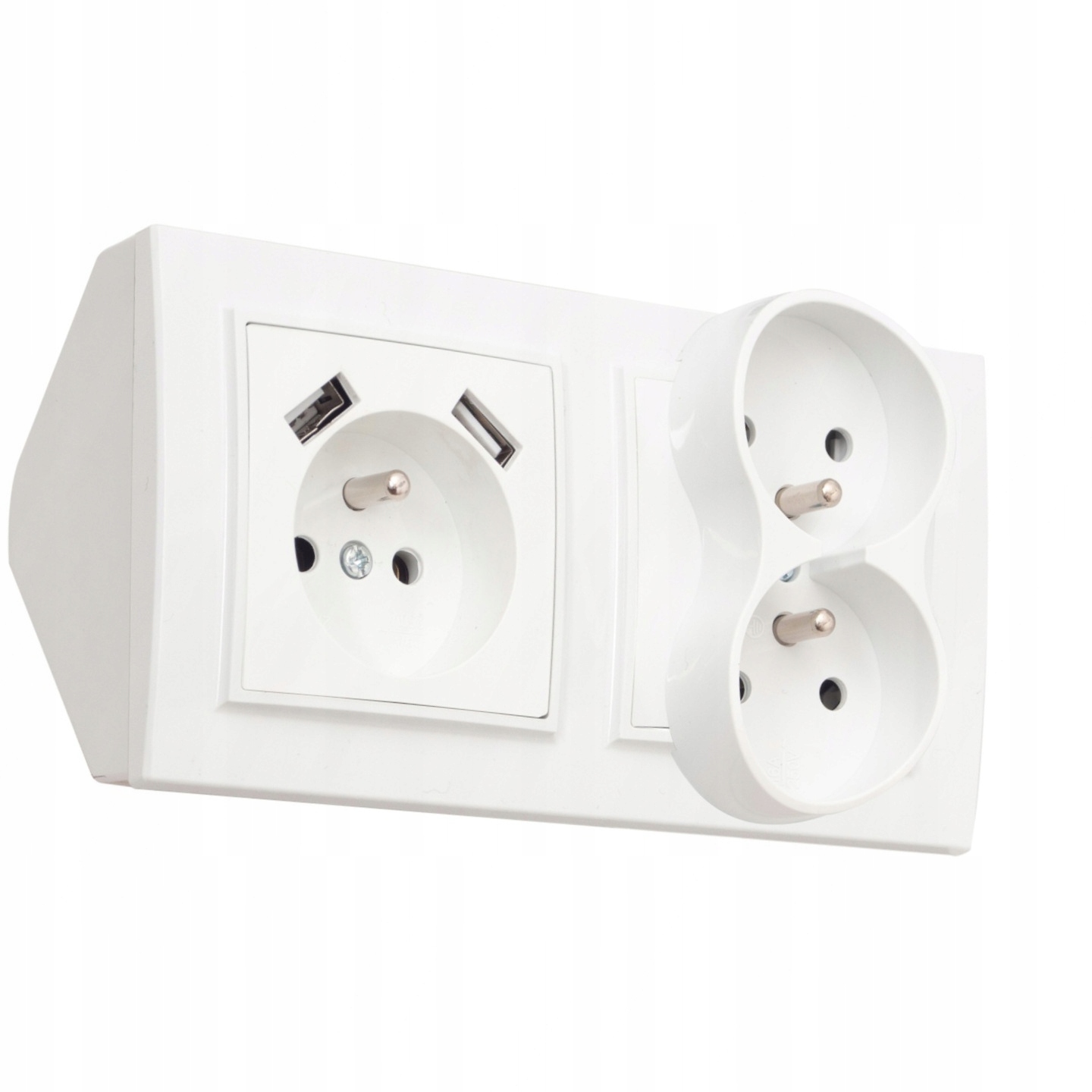 Eleganckie, potrójne gniazdo elektryczne z USBX2 w ramce oraz puszcze narożnej. Idealnie sprawdzi się w każdym wnętrzu – od nowoczesnych mieszkań po biura.