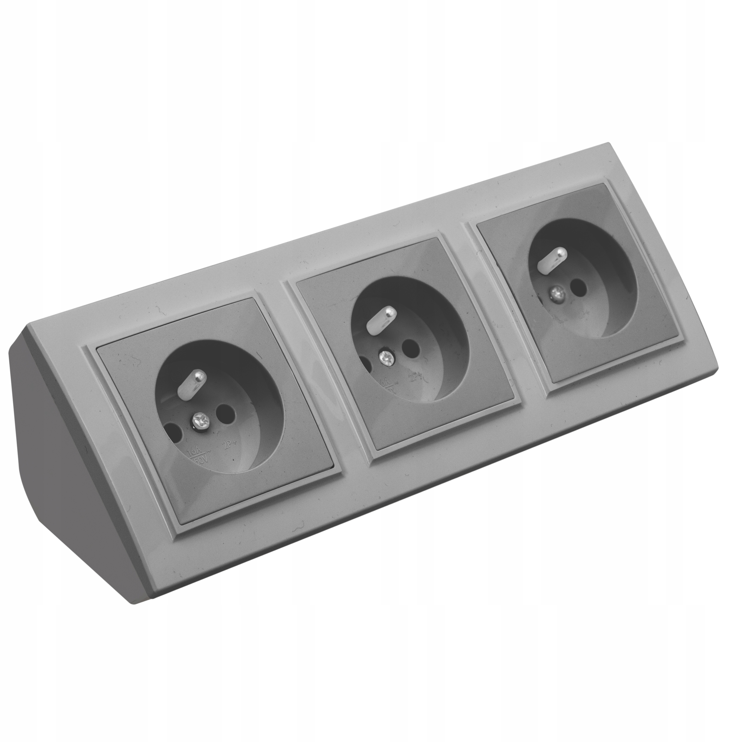 - Rodzaj: gniazdko z uziemieniem, w ramce plastikowej szarej, w puszce potrójnej, narożnej,