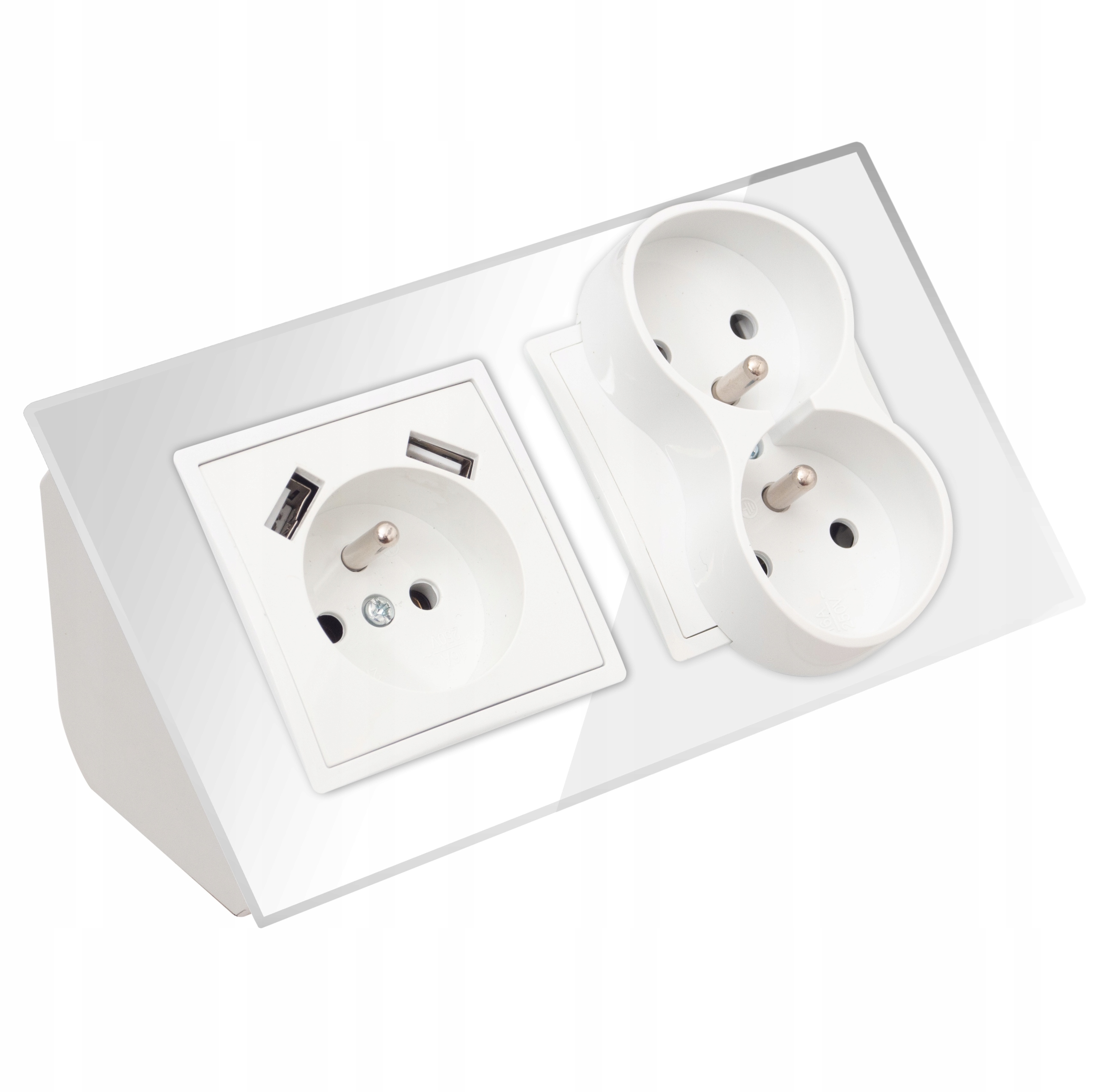 Gniazdo szklane, potrójne, nablatowe, białe -kuchenne, meblowe, biurkowe z USB x2