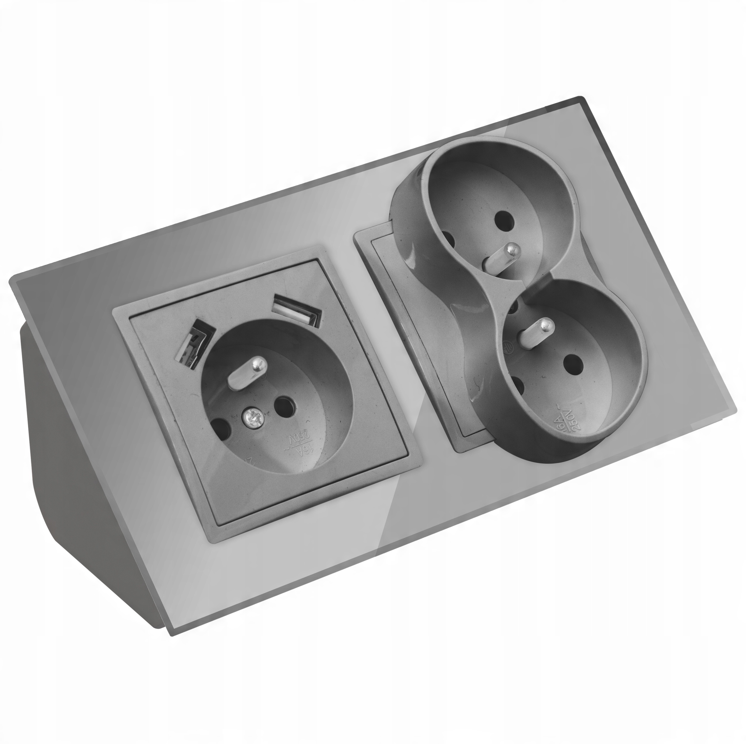 GNIAZDO POTRÓJNE SZKLANE MEBLOWE NAROŻNE BIURKOWE KUCHENNE 2XUSB SZARE