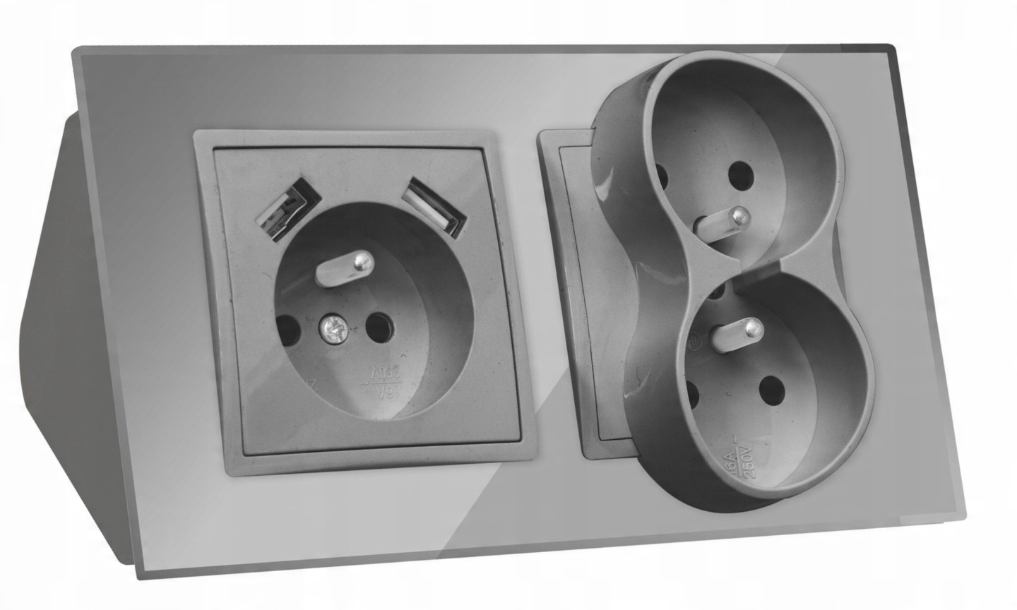 - Rodzaj: gniazdko z uziemieniem z USBX2, w ramce szklanej szarej, w puszce podwójnej, narożnej,
