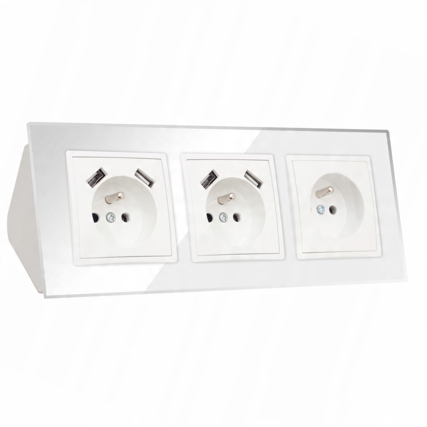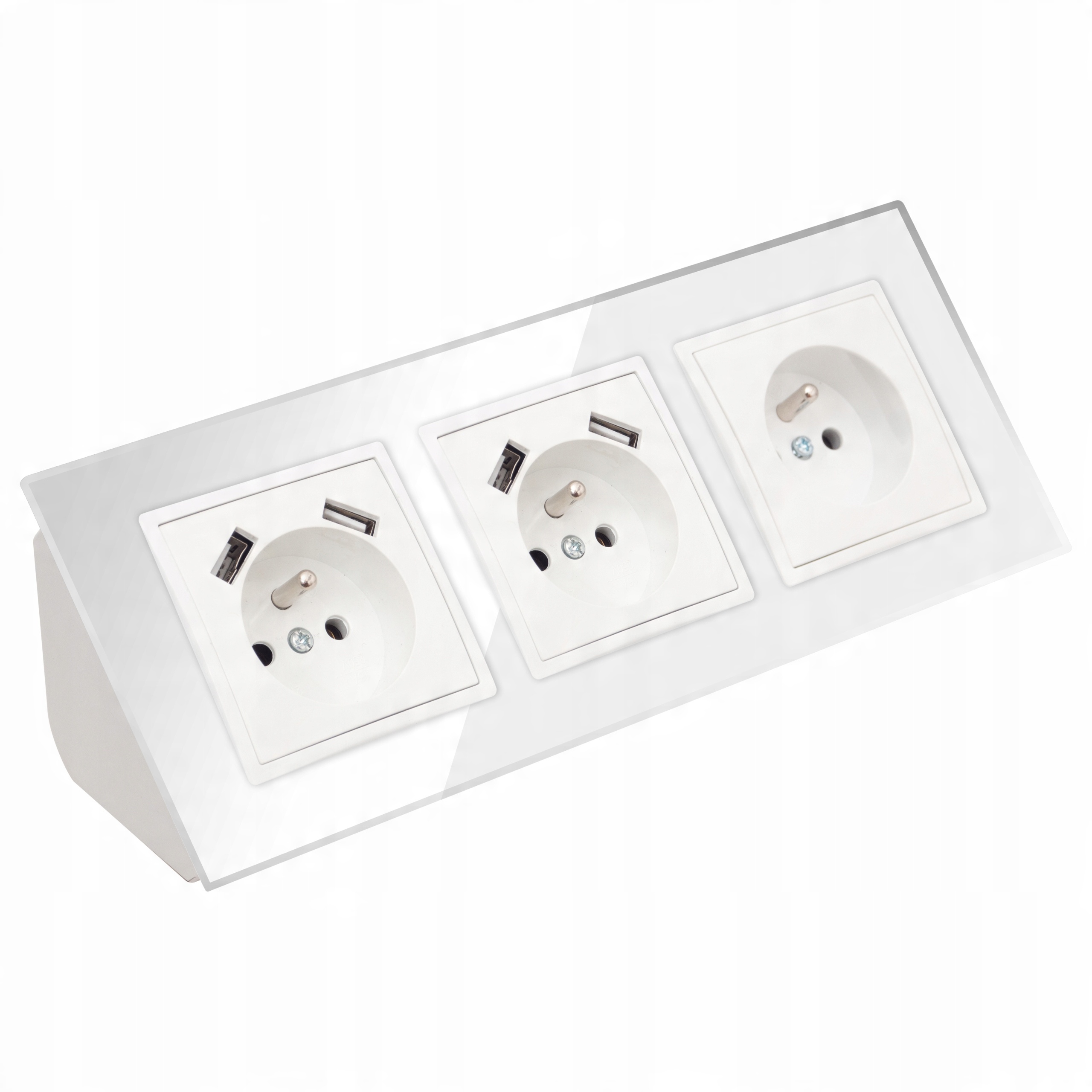 Gniazdo szklane, potrójne, nablatowe, białe -kuchenne, meblowe, biurkowe z USB.