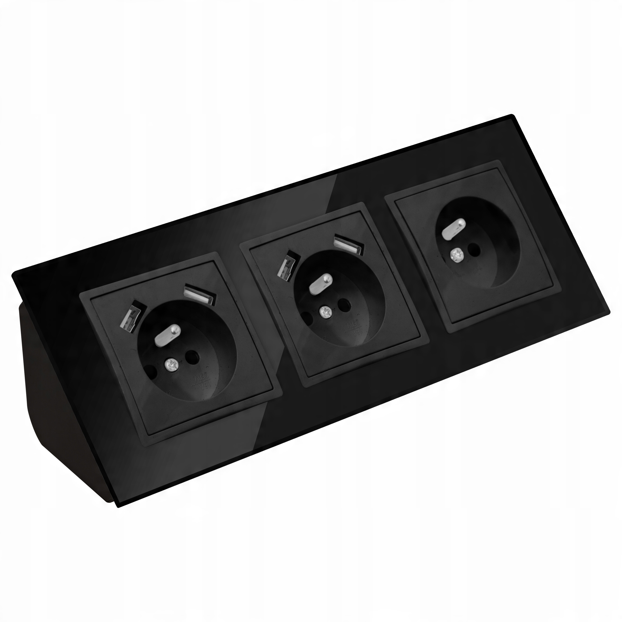 Gniazdo szklane, potrójne, nablatowe, czarne-kuchenne, meblowe, biurkowe z USBX4.