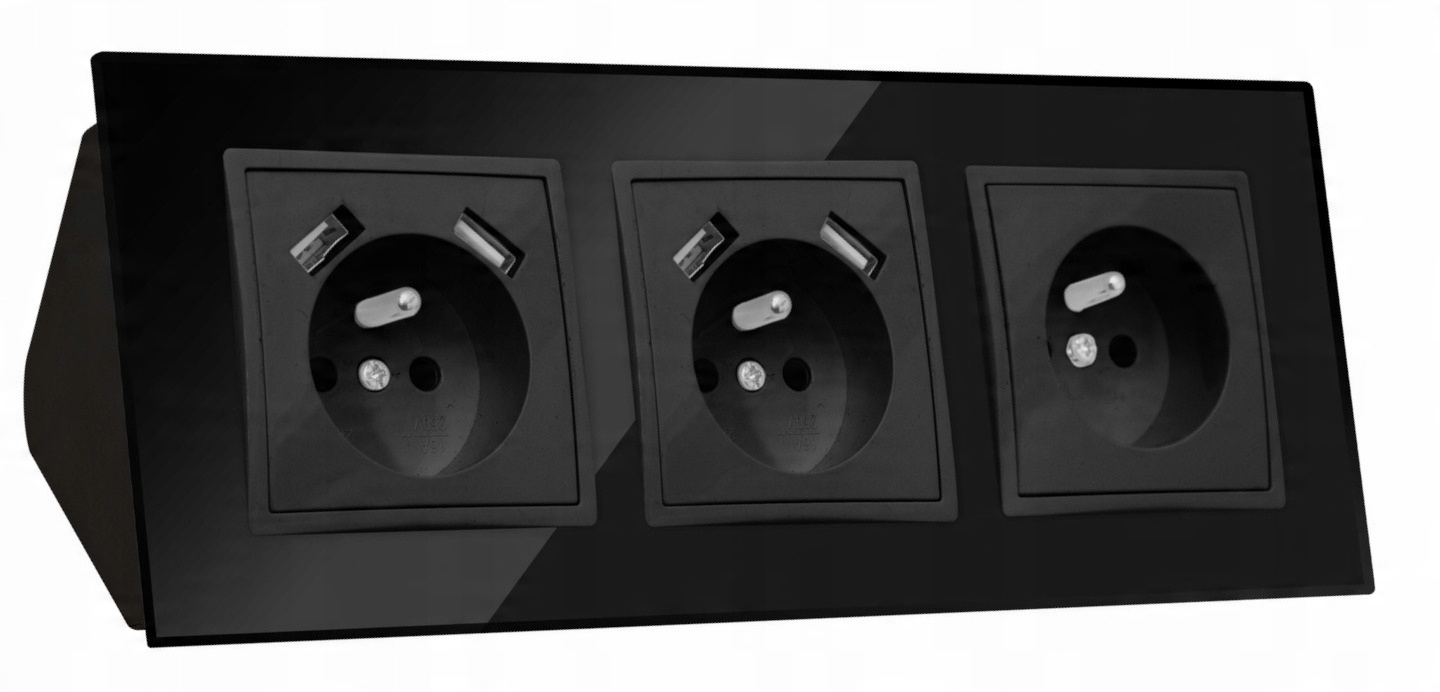 - Rodzaj: gniazdko z uziemieniem z USBx4, w ramce szklanej czarnej, w puszce potrójnej, narożnej,