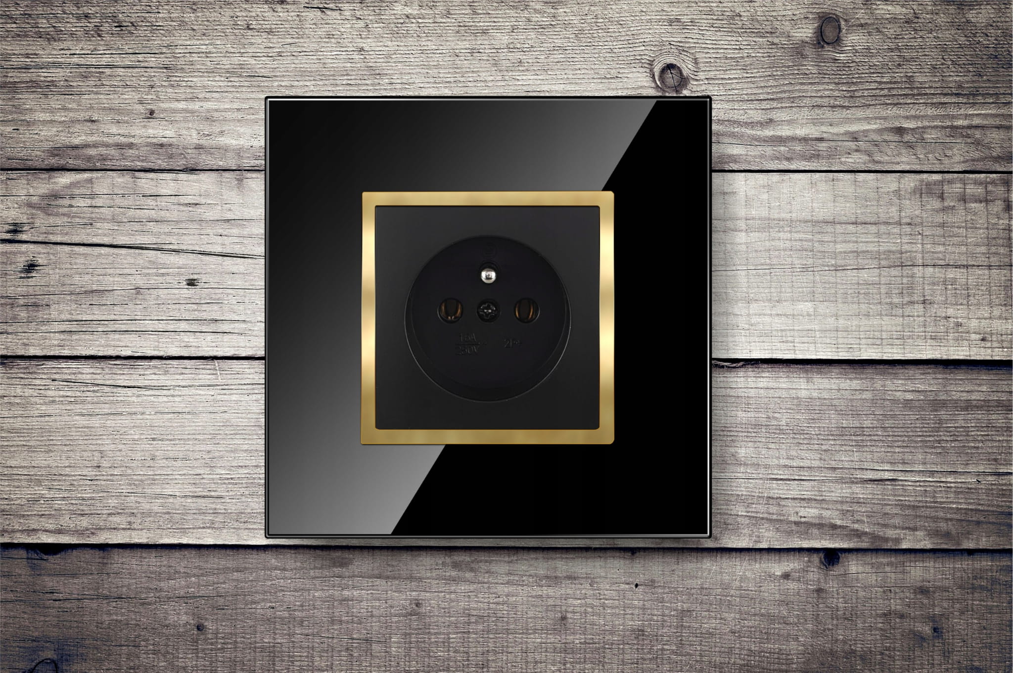 Gniazdko pojedyncze, z uziemieniem, w kolorze czarnym, z rantem złotym, podtynkowe, w ramce czarnej, szklanej.