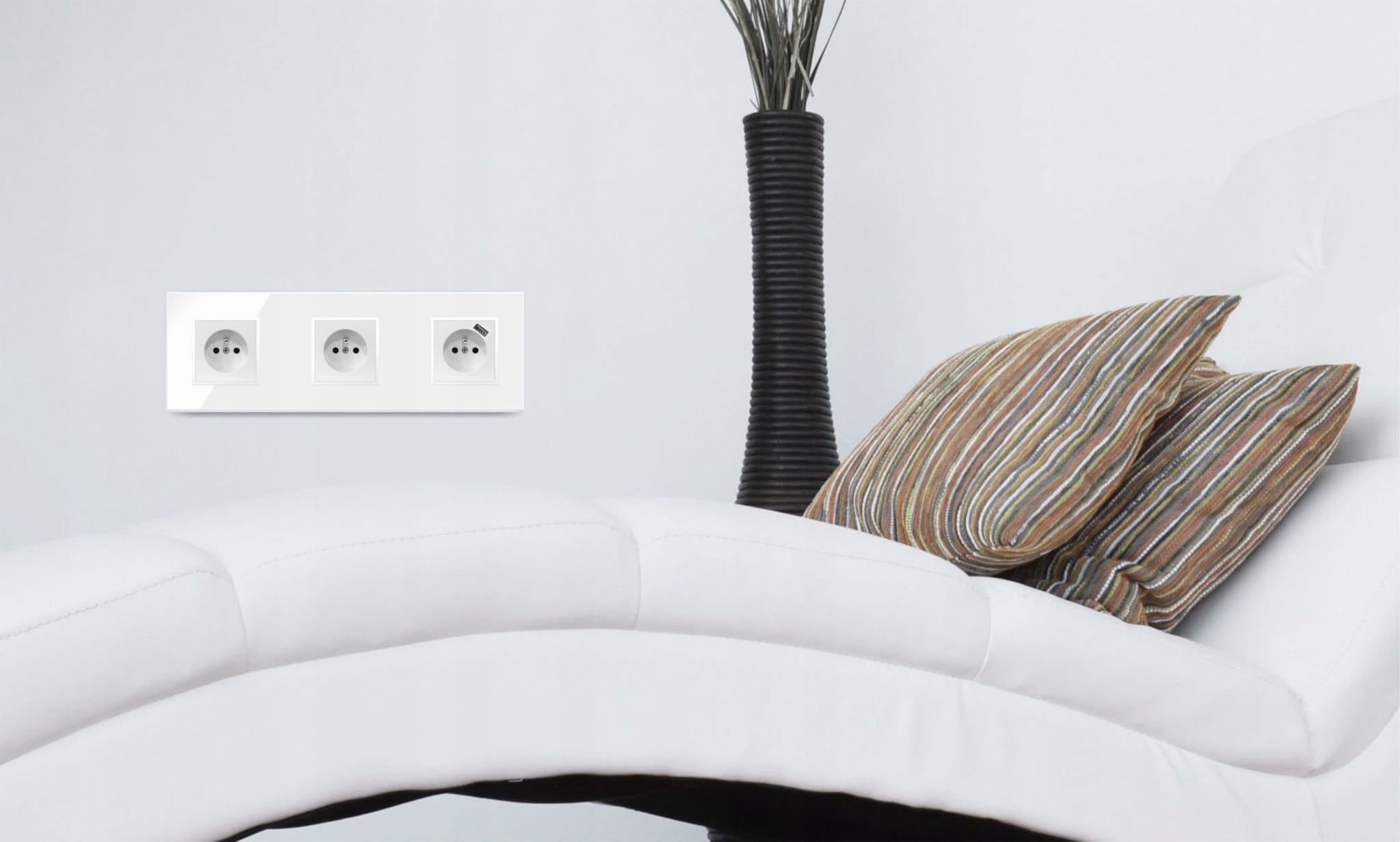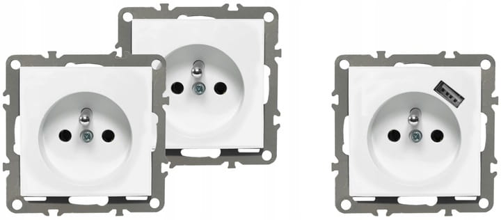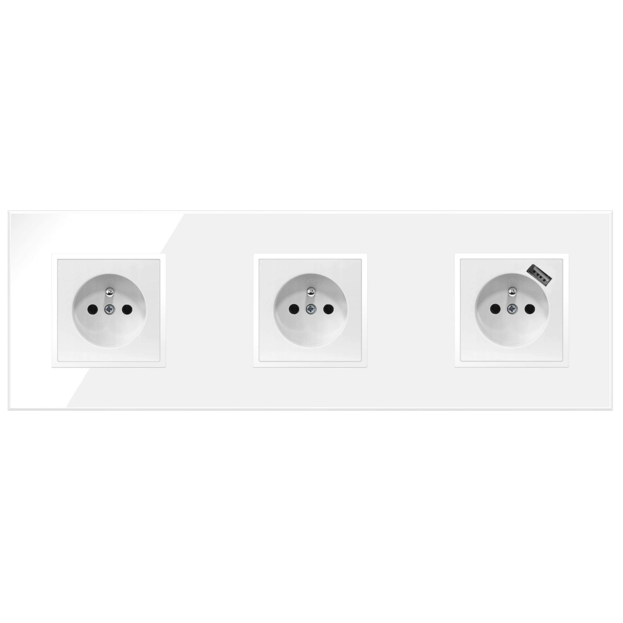 - Rodzaj:2x gniazdko pojedyncze z bolcem oraz 1x gniazdo z bolcem i ładowarką USB, w ramce potrójnej szklanej białej,