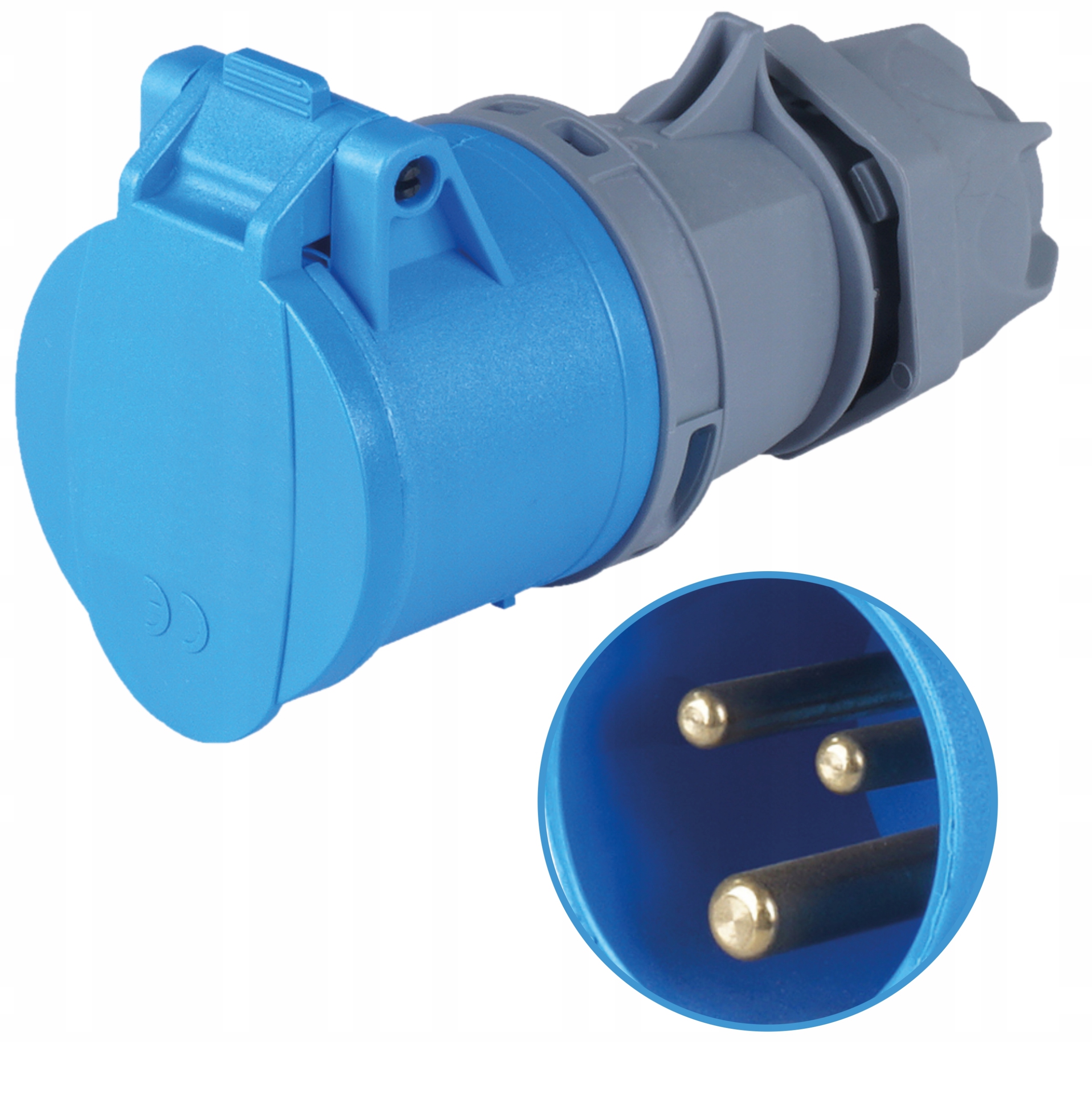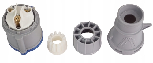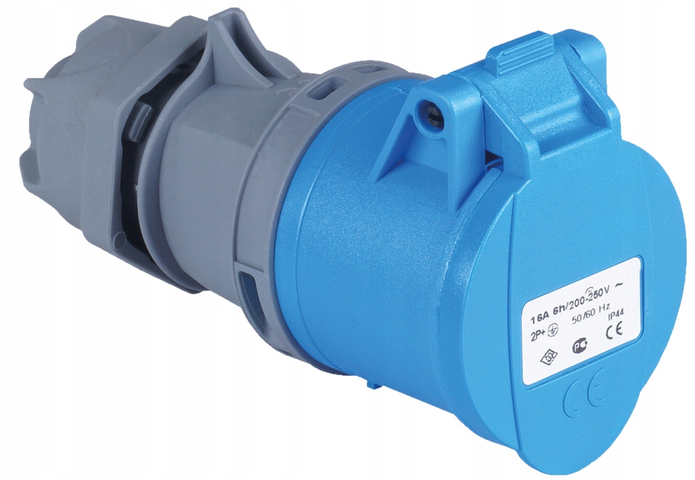 Maksymalne obsługiwane napięcie to 240V, a prąd znamionowy wynosi 16A. Produkty są barwy szaro- niebieskiej i mają gwarantowany stopień ochrony na poziomie IP44. Styki wykonane są z mosiądzu.