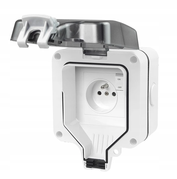 - MATERIAŁ OBUDOWY - TWORZYWO SZTUCZNE- odporne na warunki atmosferyczne. Zewnętrzne gniazdo elektryczne może wytrzymać wszystkie warunki pogodowe i jest bardzo trwałe. Pokrywa chroni gniazda elektryczne przed warunkami atmosferycznymi. Pokrywa jest zapinana na klamry, dzięki czemu woda i kurz nie przedostają się do środka. Aby chronić dzieci przed niebezpieczeństwem, należy zawsze zamykać pokrywę, niezależnie od tego, czy zasilanie jest włączone, czy wyłączone.