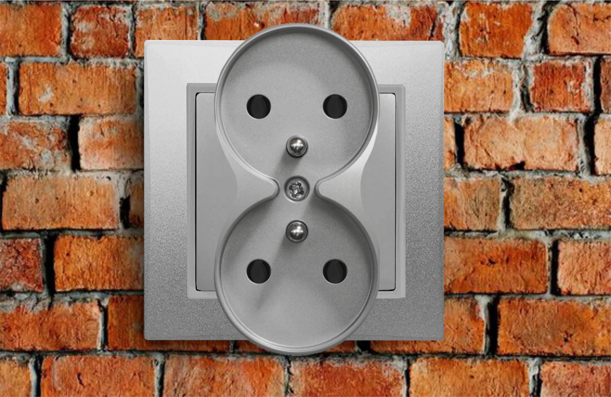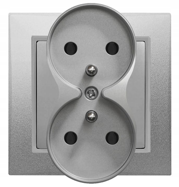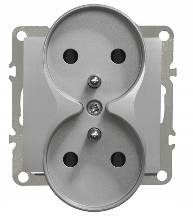 Gniazdko podwójne, z uziemieniem, w kolorze szarym, podtynkowe, do ramki pojedynczej plastikowej, do montażu również w ramce wielokrotnej.
