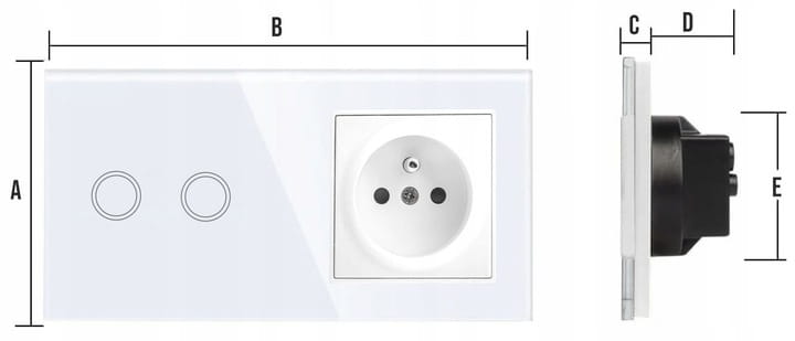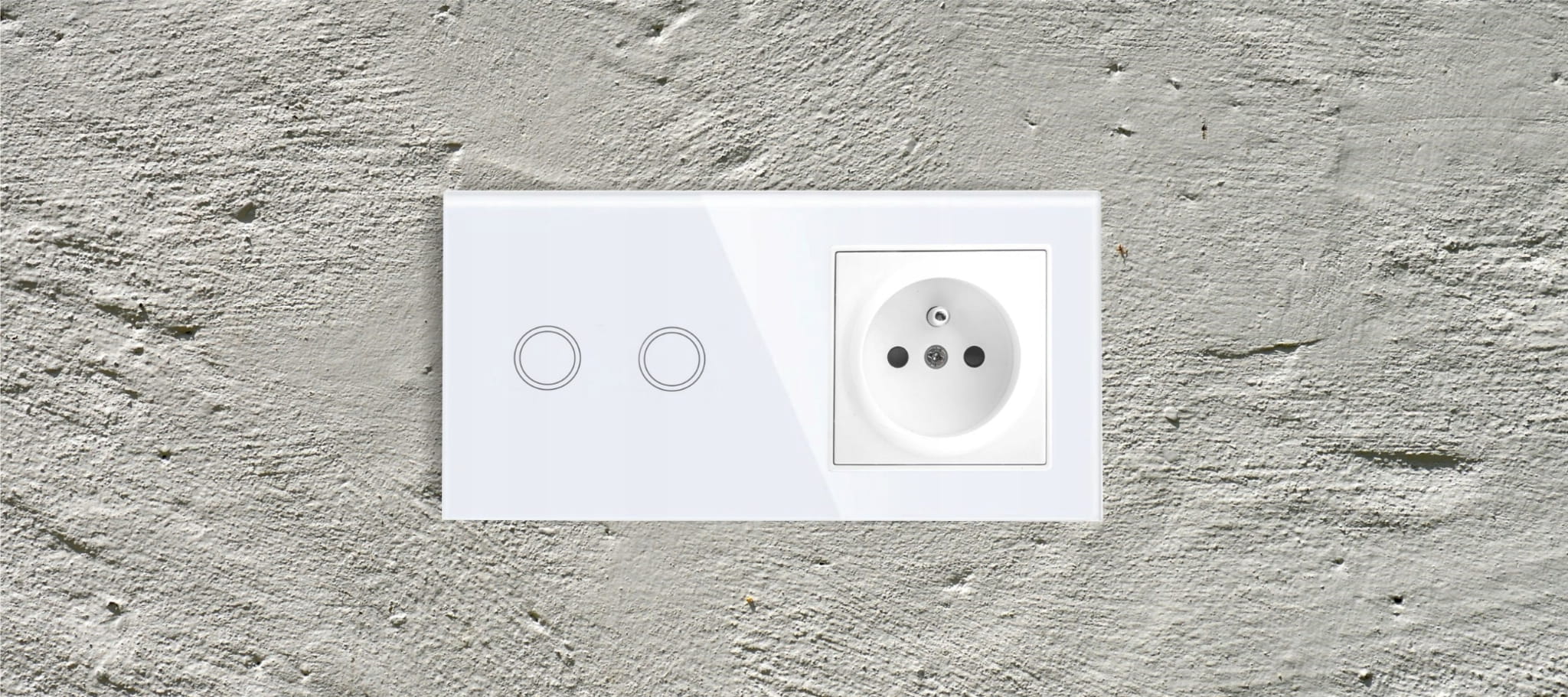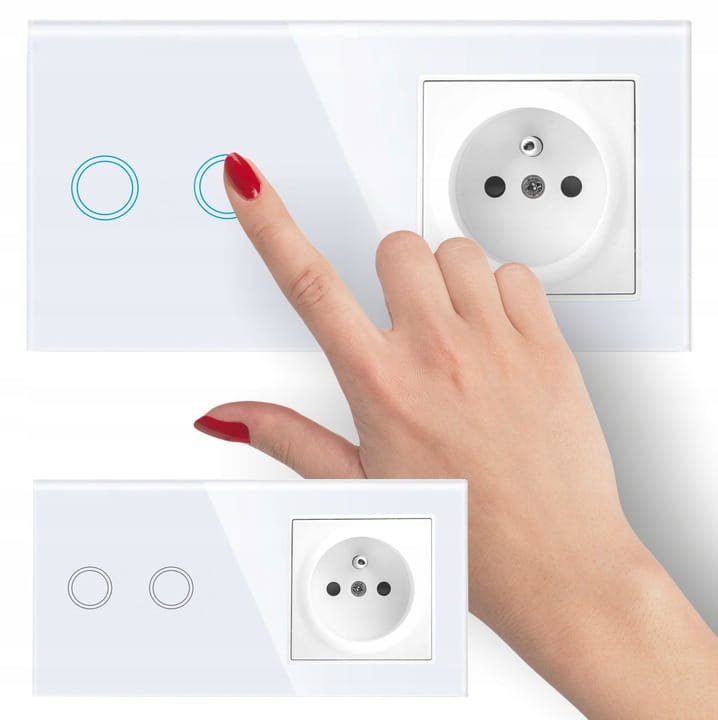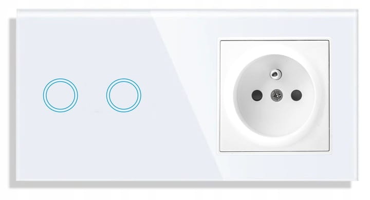 Panel szklany podwójny, z włącznikiem podwójnym oraz gniazdem z bolcem, w kolorze białym, kompatybilny z mechanizmami dotykowymi, marki Qtouch.