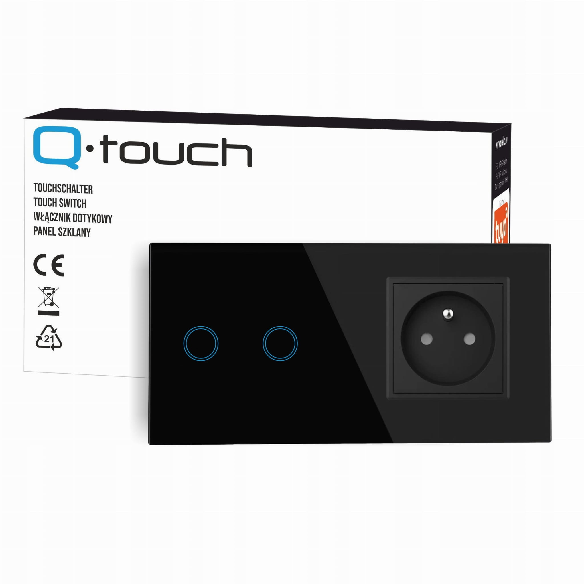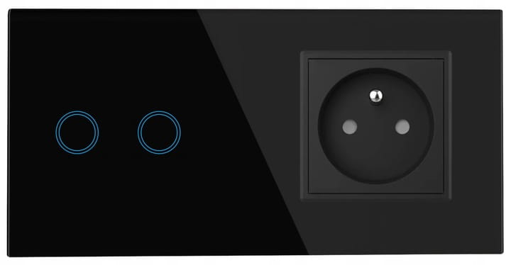 Panel szklany podwójny, z włącznikiem podwójnym oraz gniazdem z bolcem, w kolorze czarnym, kompatybilny z mechanizmami dotykowymi, marki Qtouch.
