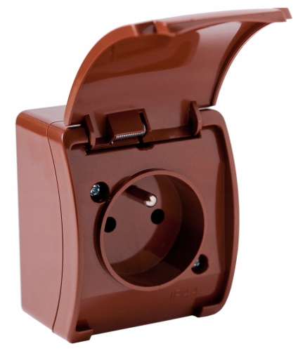 Gniazdo pojedyncze, hermetyczne, z klapką, natynkowe, w kolorze brązowym.